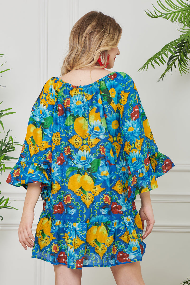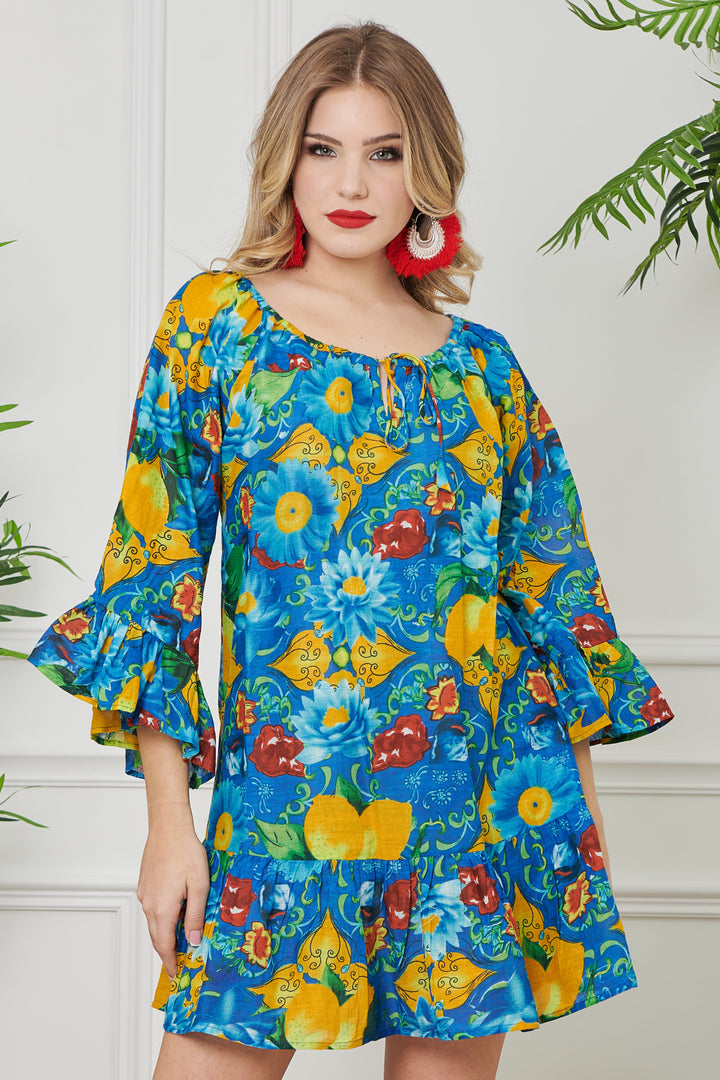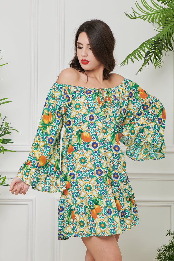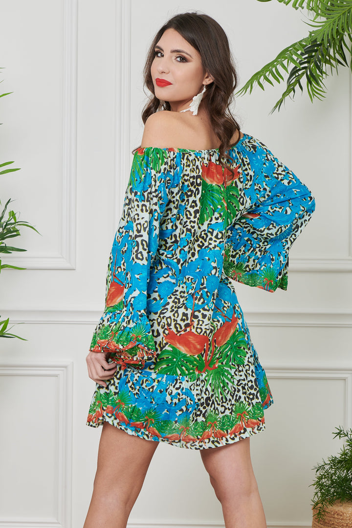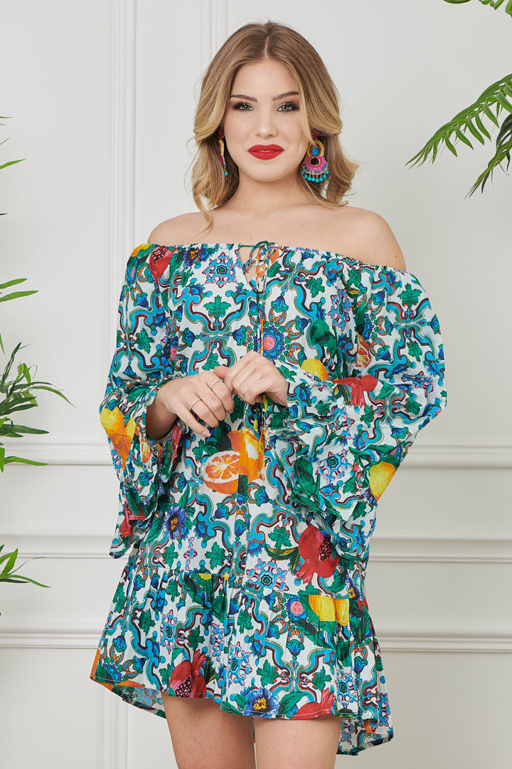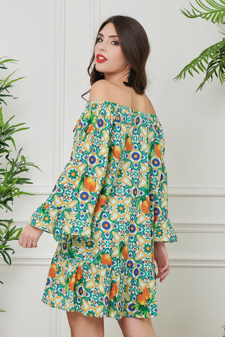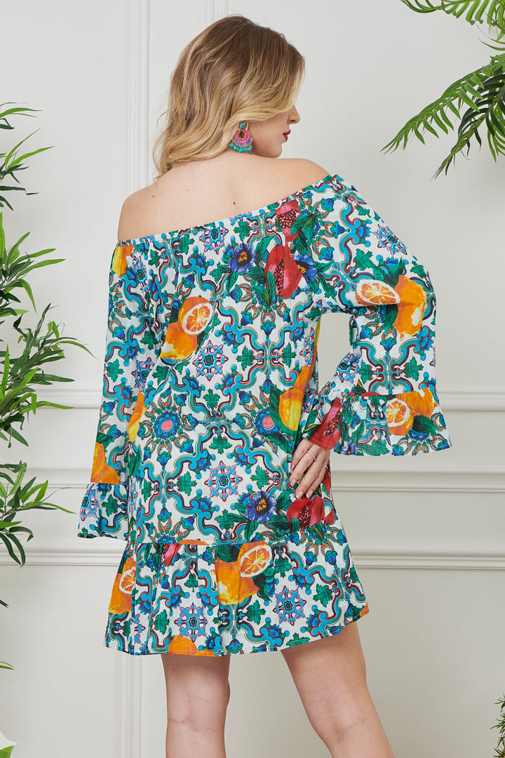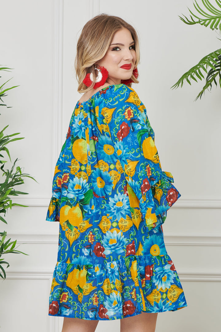 Este vestido de puro algodón se caracteriza por un escote barco y mangas acampanadas. La fantasía y el fondo volado hacen que el vestido sea único y original. Gracias a la impresión no colocada, cada artículo es exclusivo y de alta calidad. Un imprescindible para un estilo elegante y chic.