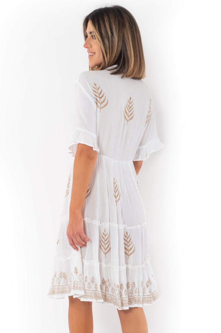 Este vestido blanco Elena es perfecto para un look romántico y elegante. Su falda con volantes y los detalles estampados a mano lo hacen único, mientras que el lazo ajustable y la línea en A lo hacen cómodo y adecuado para diferentes siluetas. Las mangas tres cuartos y la longitud media lo hacen ideal para cualquier ocasión.