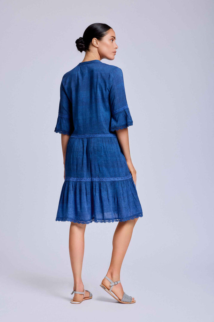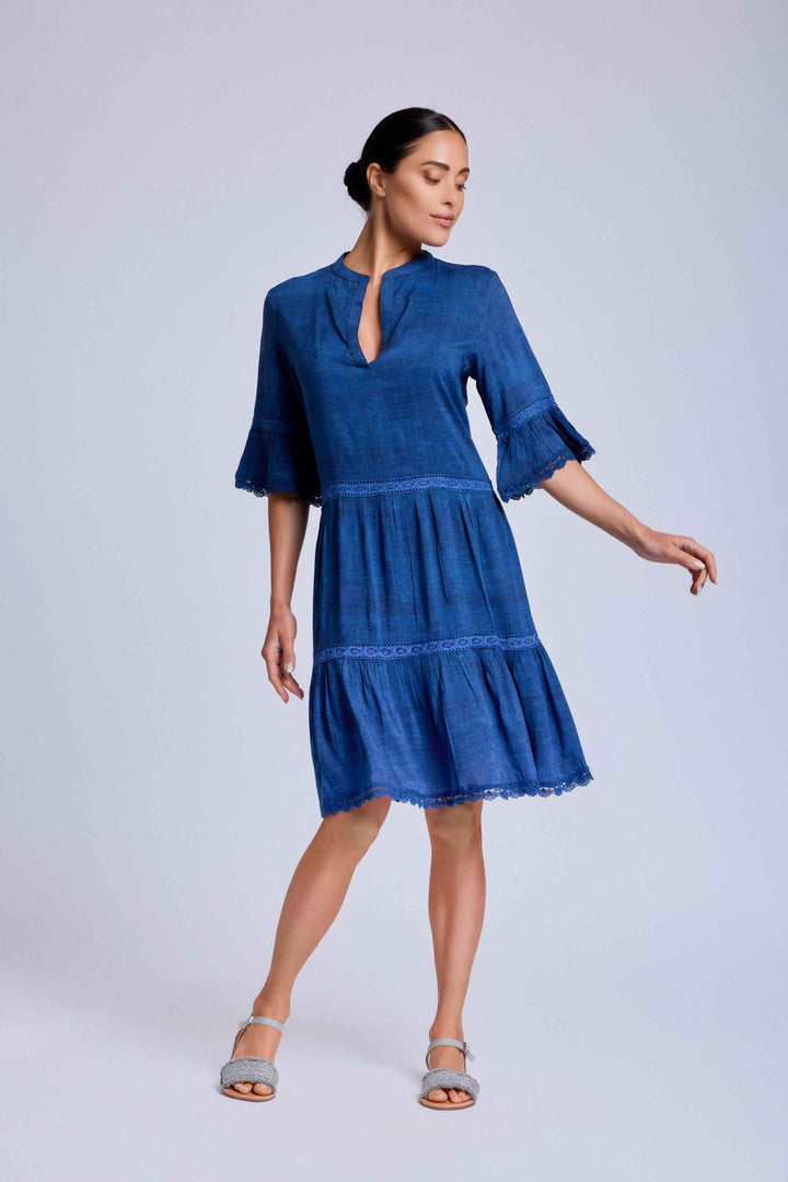 L vestido azul con manga 3/4 y escote en pico es una prenda elegante y refinada. Las inserciones y detalles de encaje aportan un toque de feminidad. Llévalo a un evento especial o a una velada romántica, tu look siempre estará impecable.