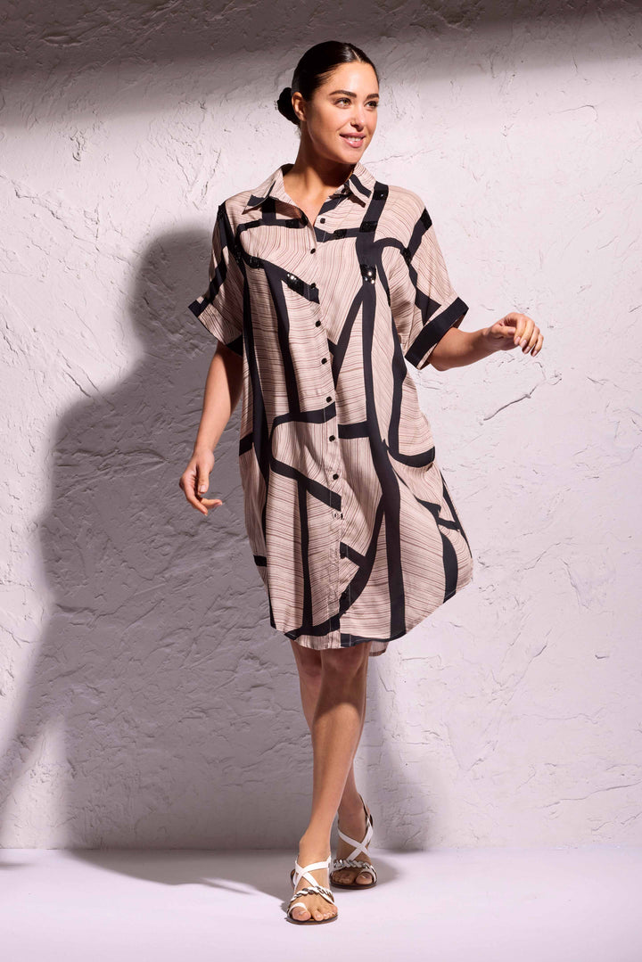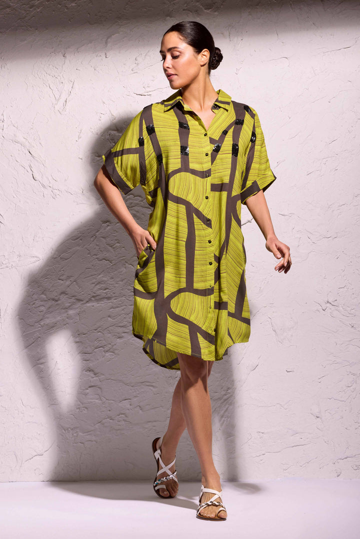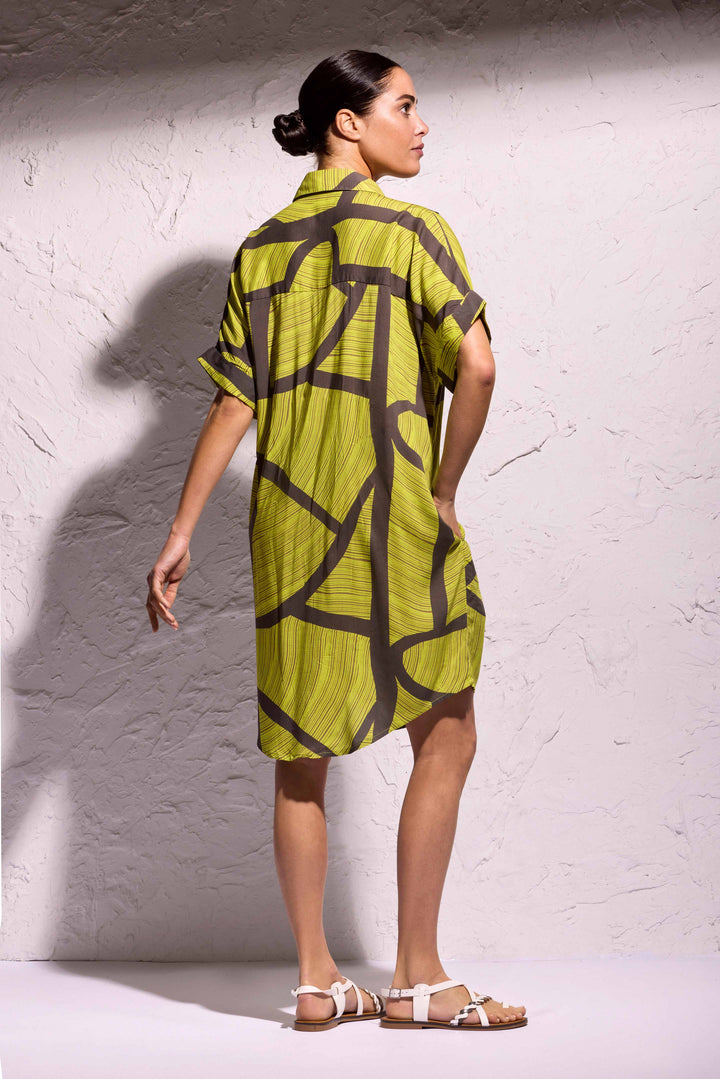 L'vestido camisa Flavia en viscosa ofrece comodidad y estilo durante los días de verano. Disponible en lima o marfil, el tejido ligero y transpirable es perfecto para un look fresco y vibrante. Con cuello y botones al frente y mangas cortas, este vestido es ideal para un look moderno y cómodo.