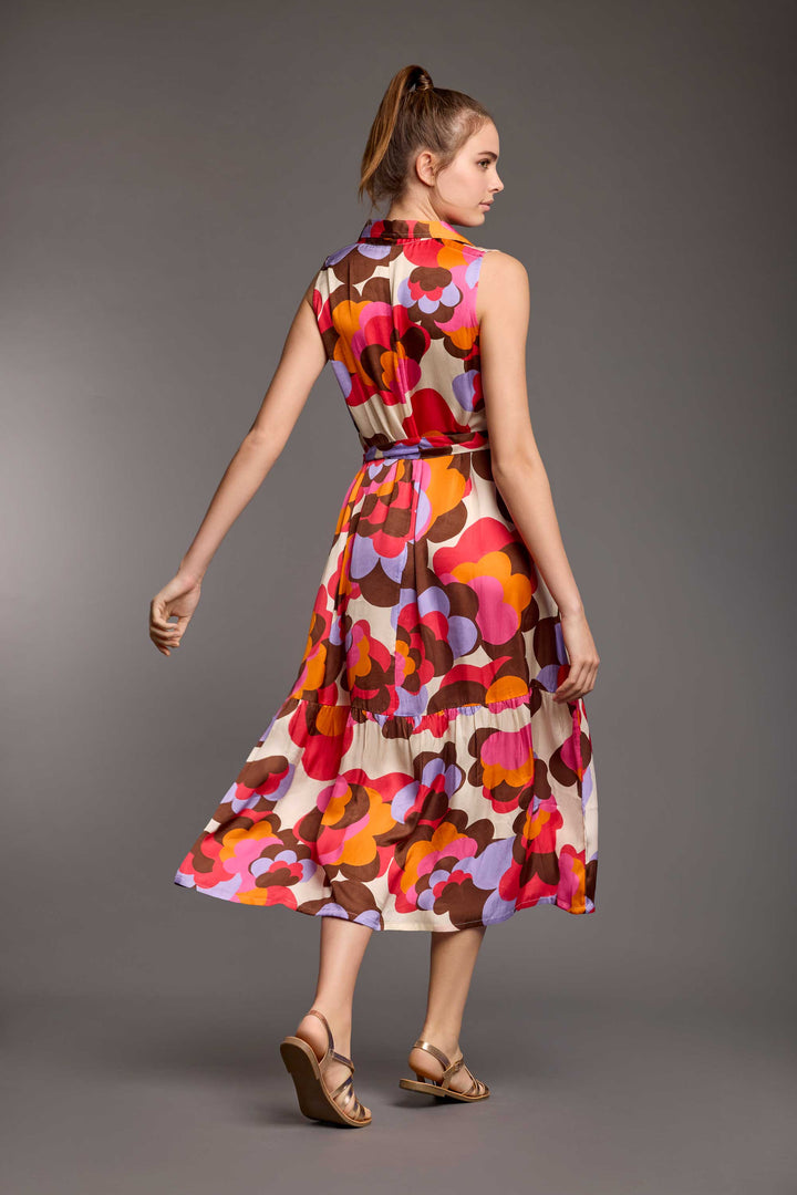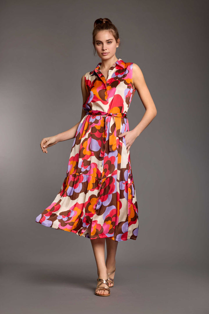L' vestido camisa largo sin mangas Gemma es la elección ideal para el verano, tanto en la ciudad como en la playa. Hecho de una mezcla de viscosa multicolor, combina estilo y comodidad con su diseño moderno y su tejido fresco. El cuello y los botones en la parte delantera, la impresión atractiva y el cinturón en cintura removible lo hacen perfecto para cualquier ocasión.