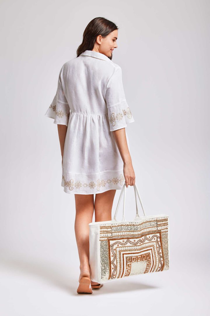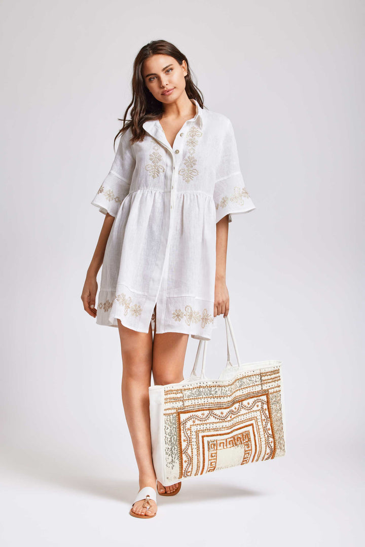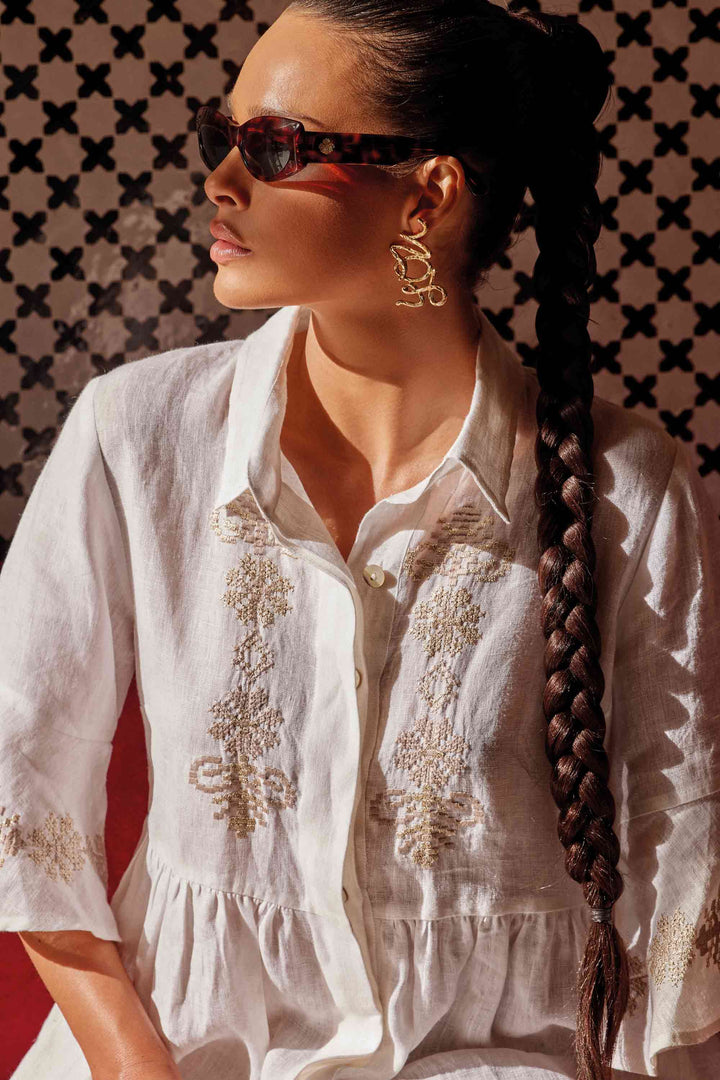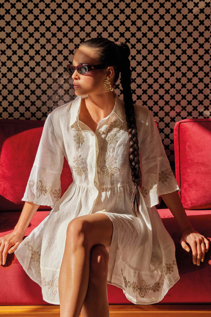 Este vestido de algodón con mangas anchas 3/4 y cuello tradicional está bordado a mano y se cierra con botones en la parte delantera. L vestido es perfecto para añadir un toque de elegancia y artesanía a tus looks.