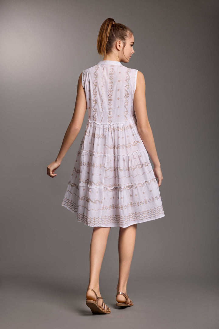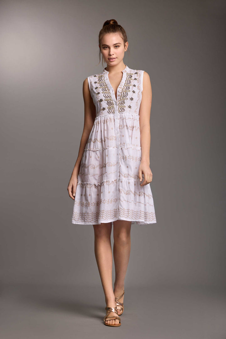 L'vestido camisa Sally sin mangas es una prenda de verano imprescindible en puro algodón blanco. Con su estilo atemporal y los botones al frente, es perfecto para cualquier ocasión, desde lo casual hasta lo chic. Además, la falda con volantes añade un toque de elegancia.