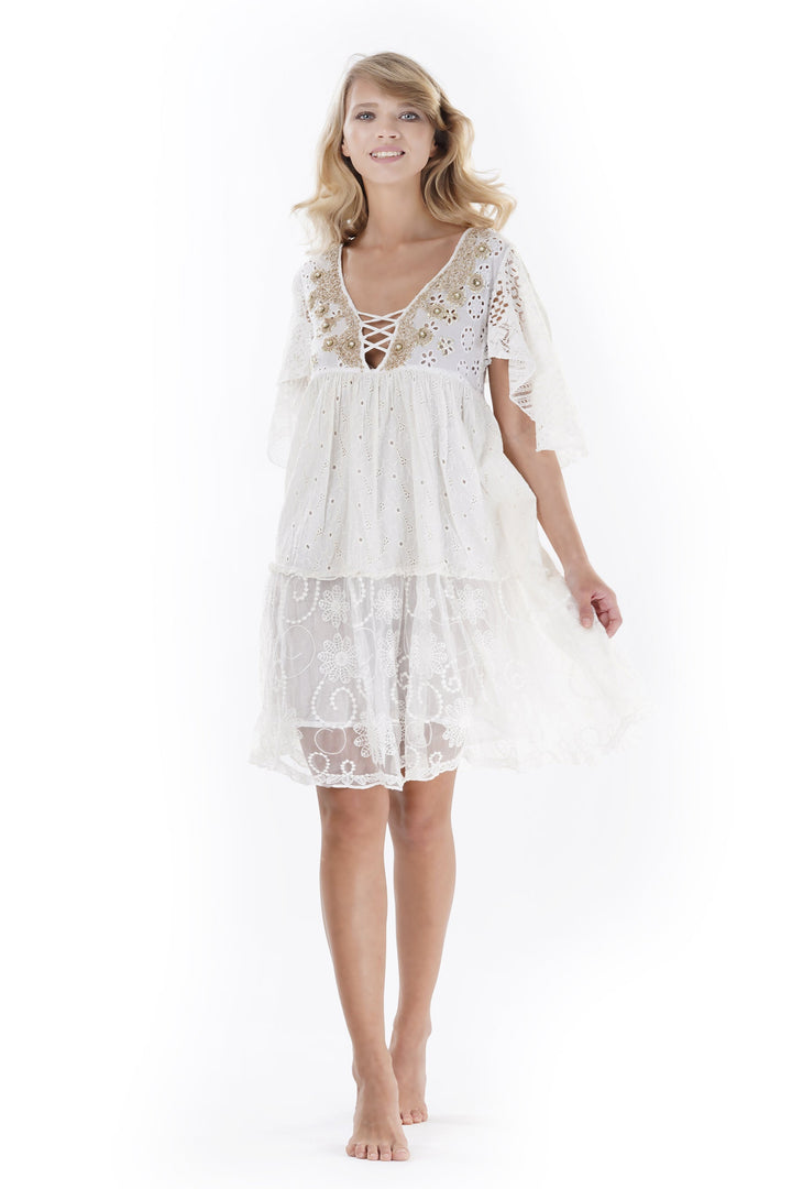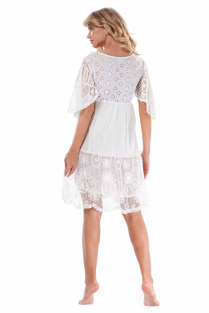 Este vestido combina elegancia y ligereza gracias a los detalles en encaje Sangallo y a la falda con transparencias refinadas. Realizado completamente en puro algodón, garantiza comodidad y transpirabilidad durante todo el día, ideal para quienes buscan una prenda sofisticada sin renunciar a la practicidad. Perfecto para ocasiones especiales o eventos de verano, expresa un estilo refinado con materiales naturales de alta calidad.
