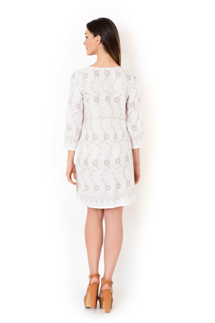 Hecho en algodón puro, este vestido blanco combina comodidad y sofisticación gracias a los delicados bordados florales. El escote en V enfatiza la silueta con elegancia, haciéndolo perfecto para quienes buscan una prenda ligera y sofisticada, ideal para los días calurosos o ocasiones informales.