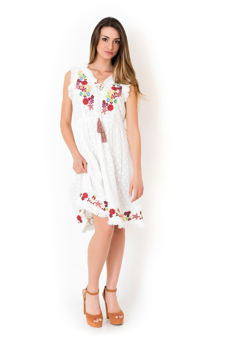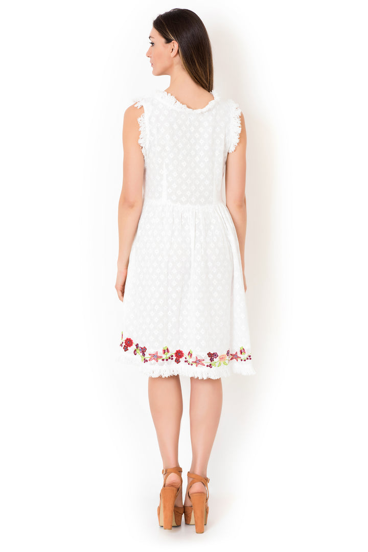Este vestido sin mangas combina elegancia y detalles artesanales con flecos en el dobladillo que añaden un toque de movimiento sofisticado. Los bordados florales embellecen la tela, realzando la silueta con un diseño refinado y distintivo, ideal para quienes buscan una prenda única y cuidada en los mínimos detalles.