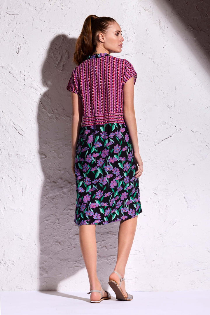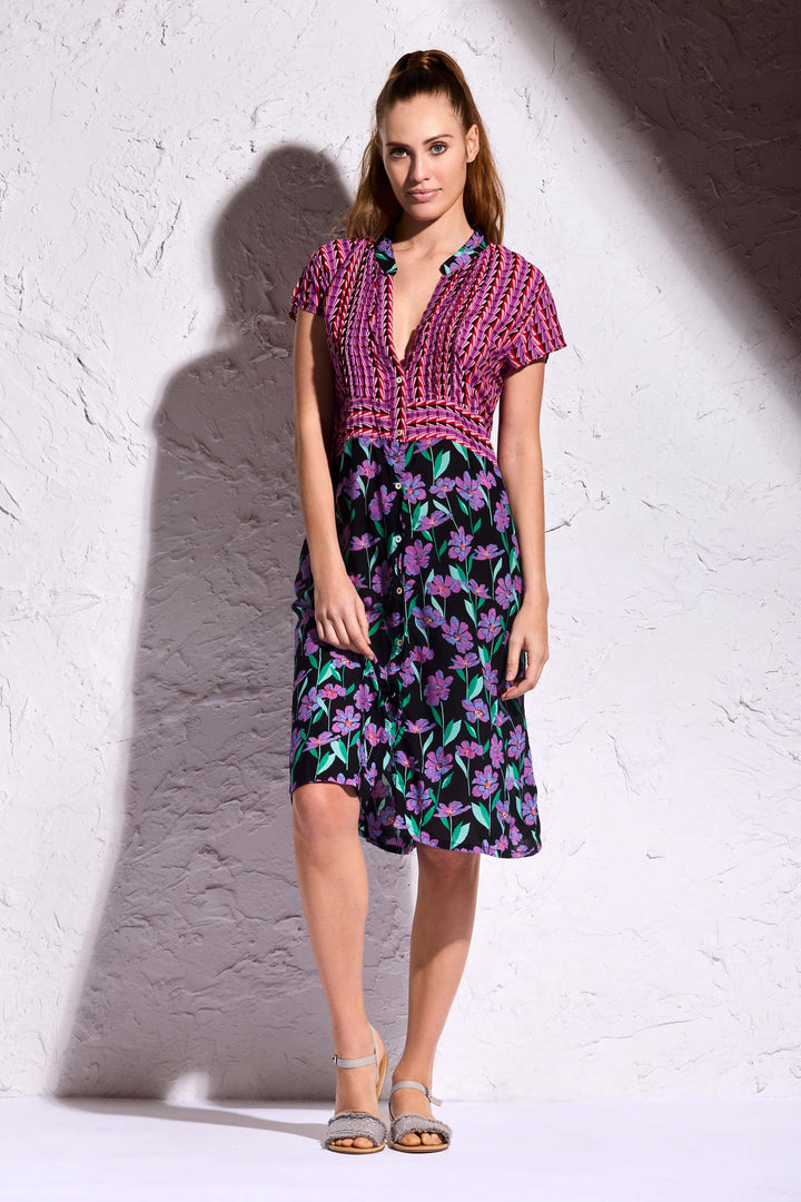 Vestido con una fascinante combinación de fantasía floral y geométrica, perfecto para quienes buscan un look fresco y dinámico. El cuello tipo coreano aporta un toque sofisticado, mientras que la botonadura frontal permite ajustar la comodidad, añadiendo practicidad y elegancia. Una prenda versátil que se adapta fácilmente a diversas ocasiones, para un outfit que no pasa desapercibido.