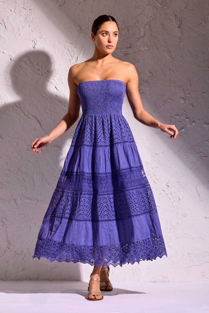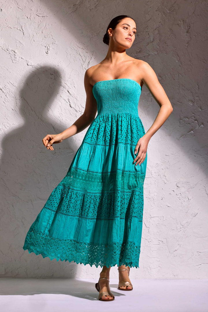 L'elegante vestido Partenope de tirantes es perfecto para el verano. Realizado en encaje de Sangallo, ofrece un look moderno gracias a su diseño versátil. El busto elástico garantiza un ajuste cómodo, mientras que los detalles de encaje añaden un toque de estilo. Descubre la máxima comodidad con este vestido largo de puro algodón.