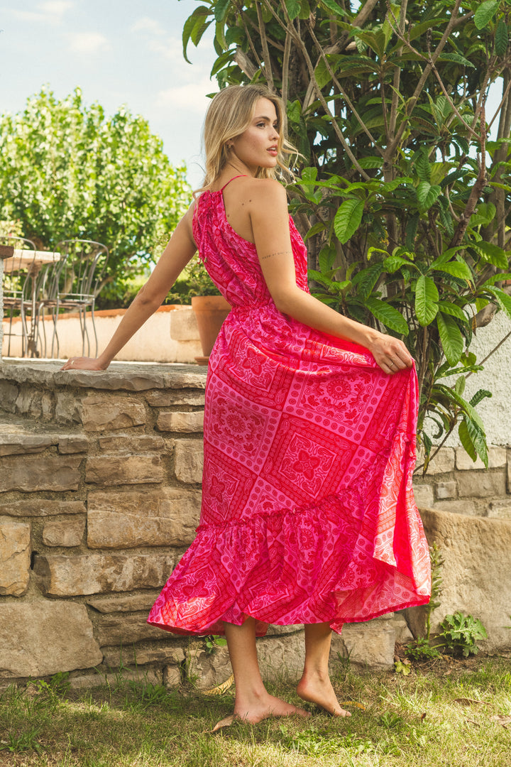 L vestido largo Amore es imprescindible para las amantes de un look elegante y femenino. Confeccionado con un modelo largo y cintura vita para un ajuste perfecto, tiene spalline ajustables para una comodidad óptima. El fantasia de bandana y el color fucsia hacen que este vestido sea único, mientras que el dobladillo con volantes añade un toque de gracia.