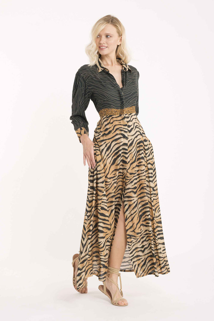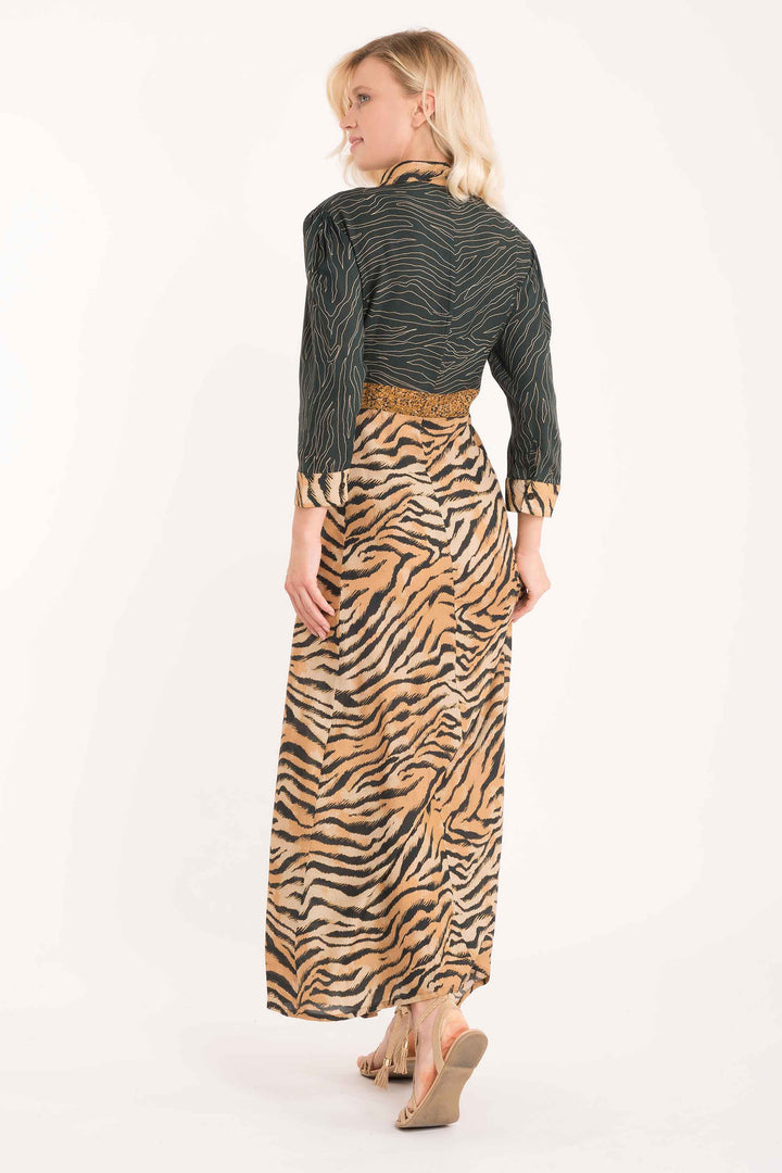 Este vestido largo presenta un cuello de camisa y un cierre completamente abotonado, garantizando un ajuste elegante y seguro. La fantasía animalier añade un toque de estilo sofisticado y contemporáneo, ideal para quienes buscan una prenda distintiva y versátil para usar en diversas ocasiones. Diseñado para realzar la figura con un diseño puro y funcional.