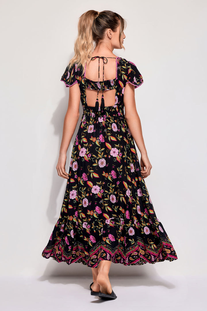 Vestido largo con mangas de volantes, perfecto para un look romántico y femenino. El cordón en cintura enfatiza la silueta, mientras que el escote en V añade un toque de elegancia. La fantasía floral vibrante aporta frescura y luminosidad, ideal para los días de verano o noches casual chic.