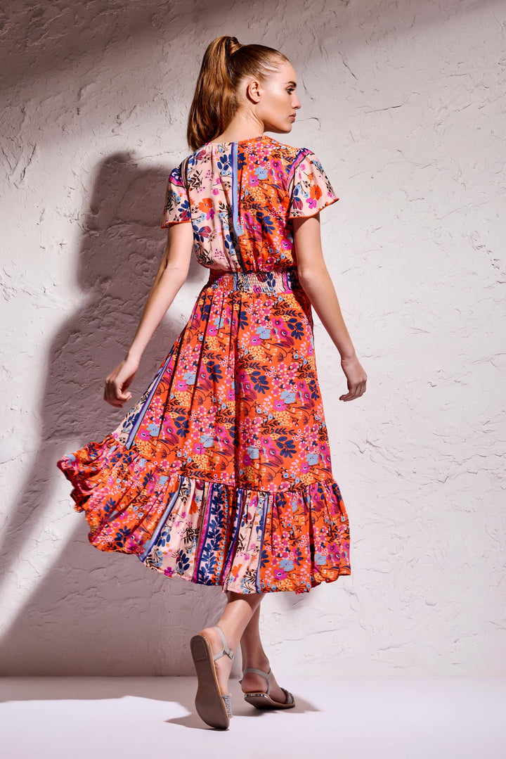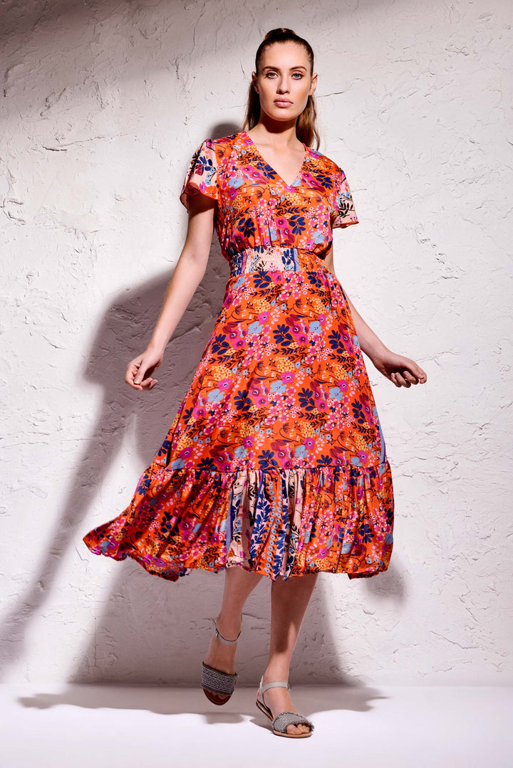 Este elegante vestido largo presenta un delicado fantasia floral y un bonito escote en pico. Las medias mangas ofrecen un toque de elegancia, mientras que la falda a balze aporta movimiento y elegancia a tu look. Perfecto para cualquier ocasión, este vestido te hará sentir segura y refinada.