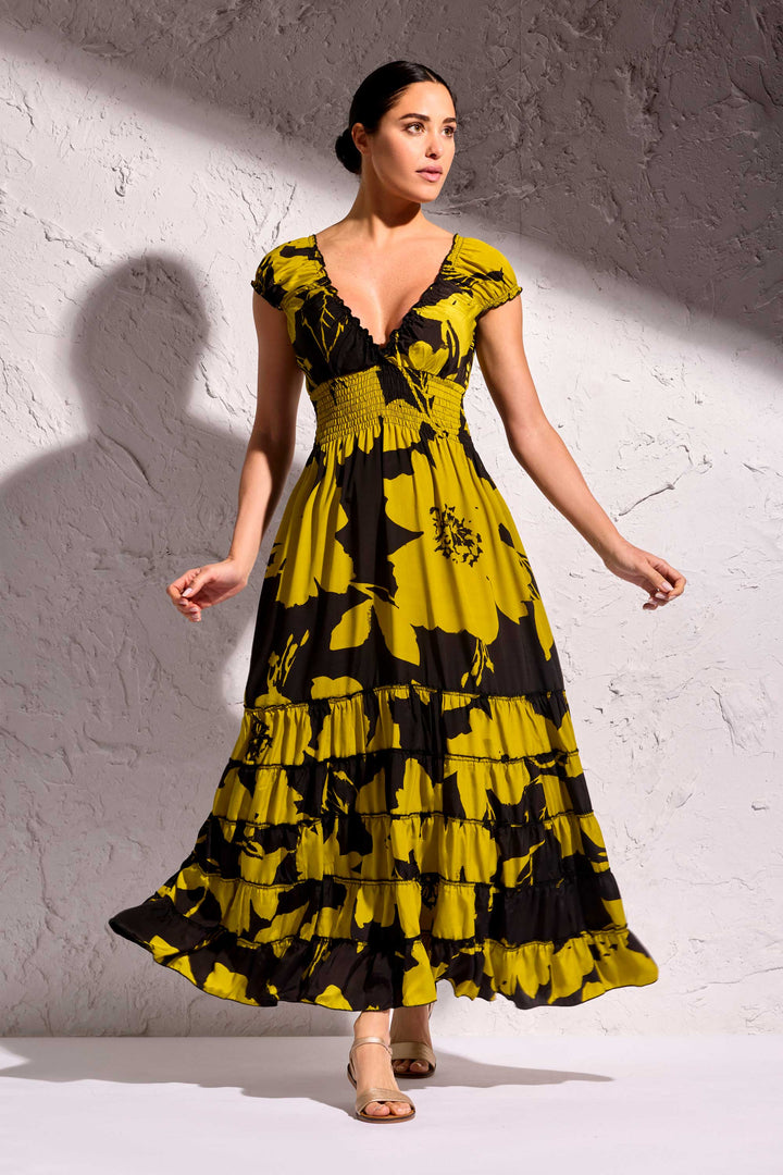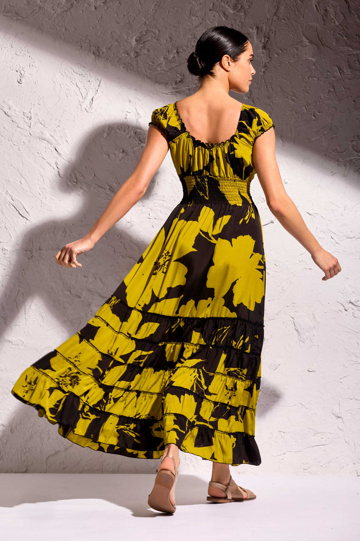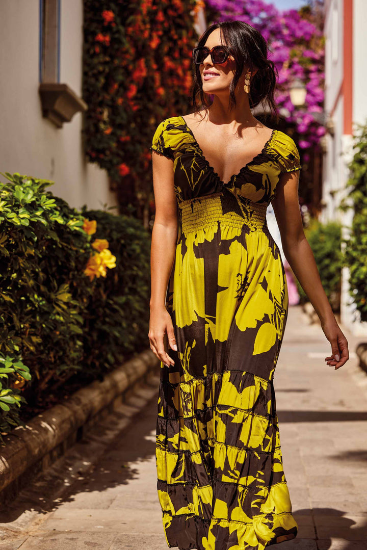 El maxi vestido Glenda en polysilk multicolor es ideal para un look de verano elegante y atemporal. El busto elástico y el tejido ligero y brillante añaden un toque de sofisticación al diseño largo y aireado, completado con delicados detalles de volantes. Perfecto para cualquier ocasión especial.