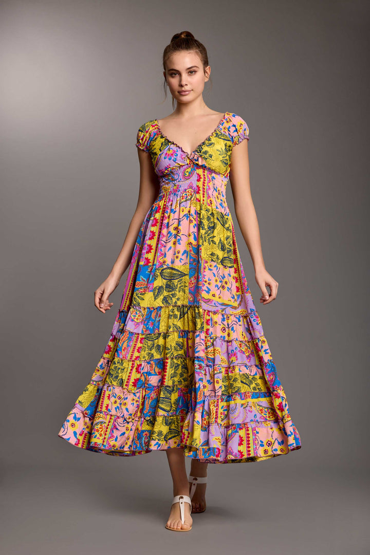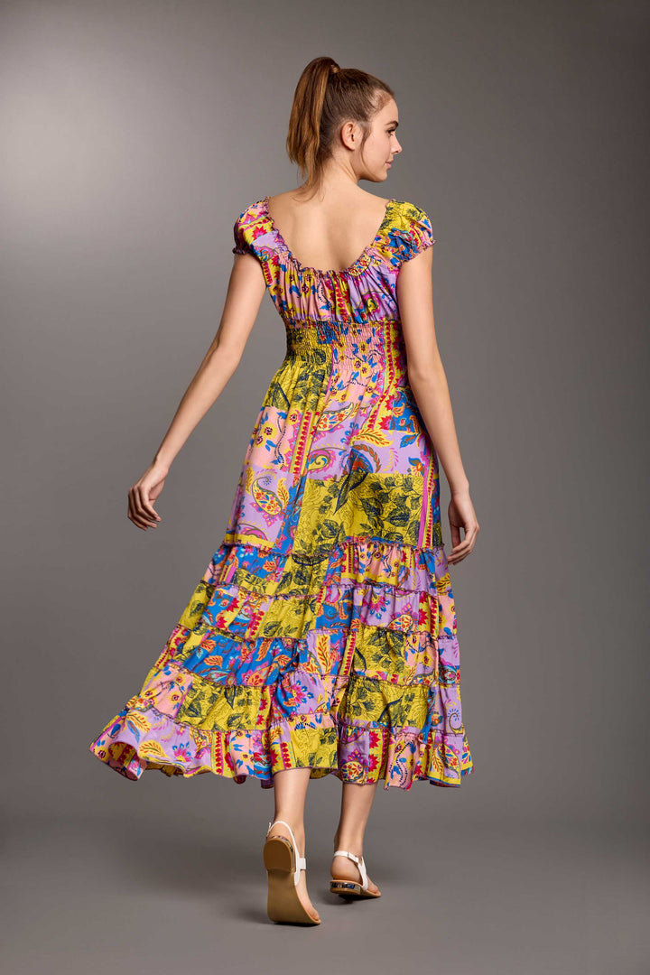 L'vestido largo Lidia en polisilk multicolor ofrece elegancia y comodidad. Perfecto para noches de verano o eventos casual chic. El diseño elegante con falda con volantes y busto elástico garantizan un look sofisticado y cómodo. Una mezcla de estilo y confort para cada ocasión.
