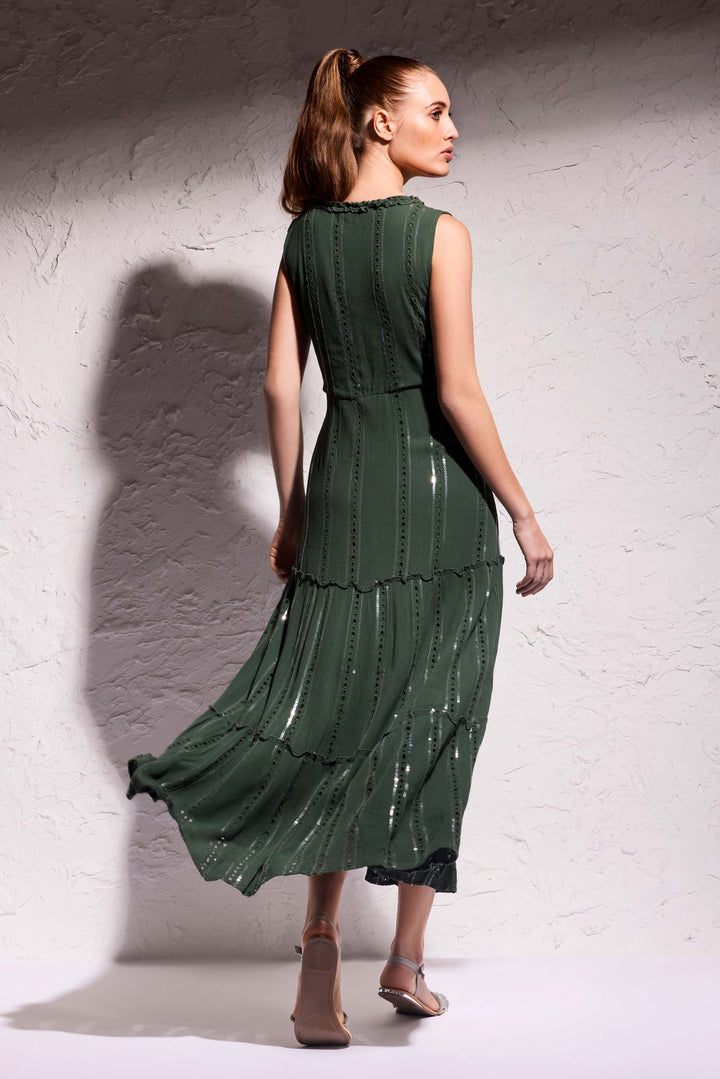 Este vestido largo verde con incrustaciones está hecho de una tela única que presenta lentejuelas bordadas a mano. Su diseño largo y sin mangas lo hace extremadamente versátil, adecuado para diversas ocasiones. Con una falda a balze y un escote en V profundo, ofrece una elegancia única.