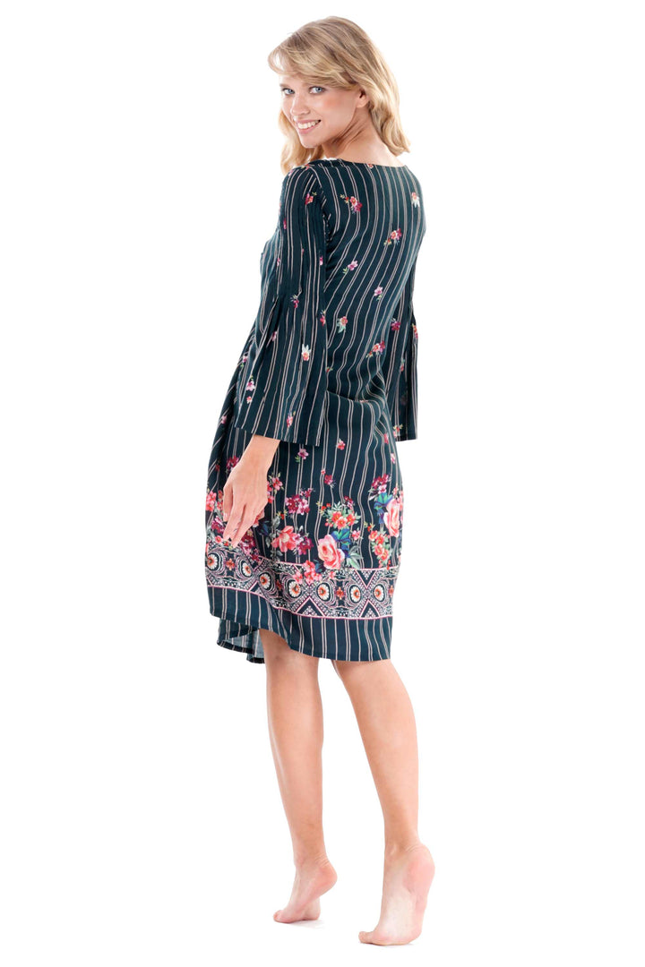 Vestido Michelle: escote en V con detalles bordados, mangas acampanadas y fondo ondulado. Fantasía de mayólica, rayas y flores para un estilo único y divertido.