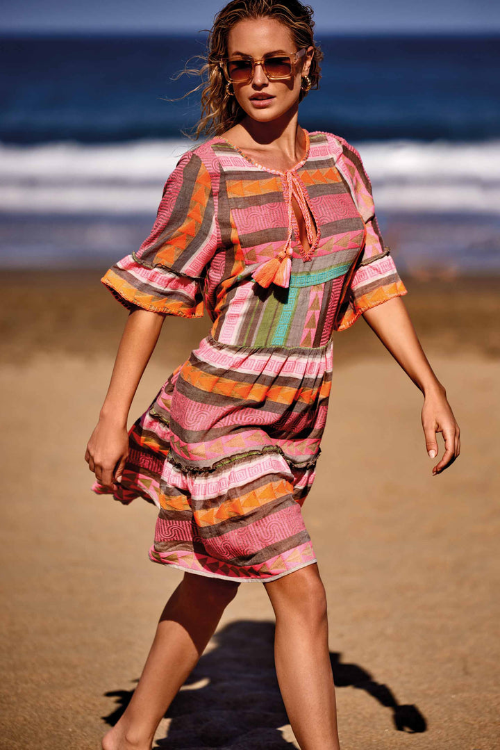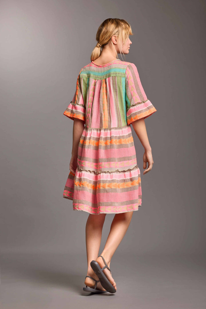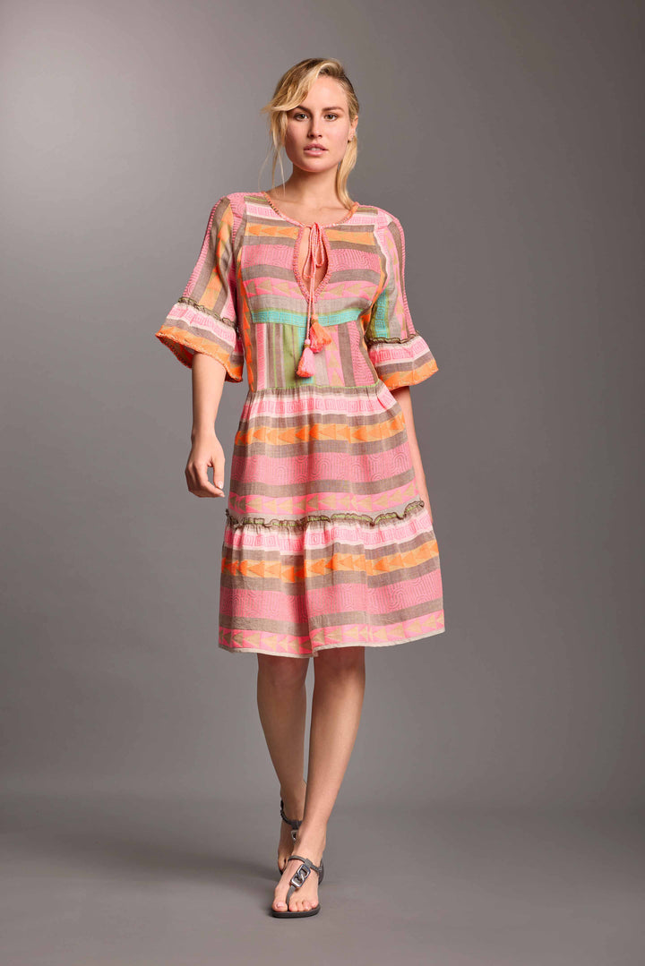 L' vestido Penelope, en viscosa multicolor, es perfecto para un look de verano elegante y cómodo. El escote con lazo y borlas, las mangas 3/4 y la impresión multicolor vibrante lo hacen adecuado para cualquier ocasión. Aprovecha el ajuste cómodo para un atuendo fresco y chic.
