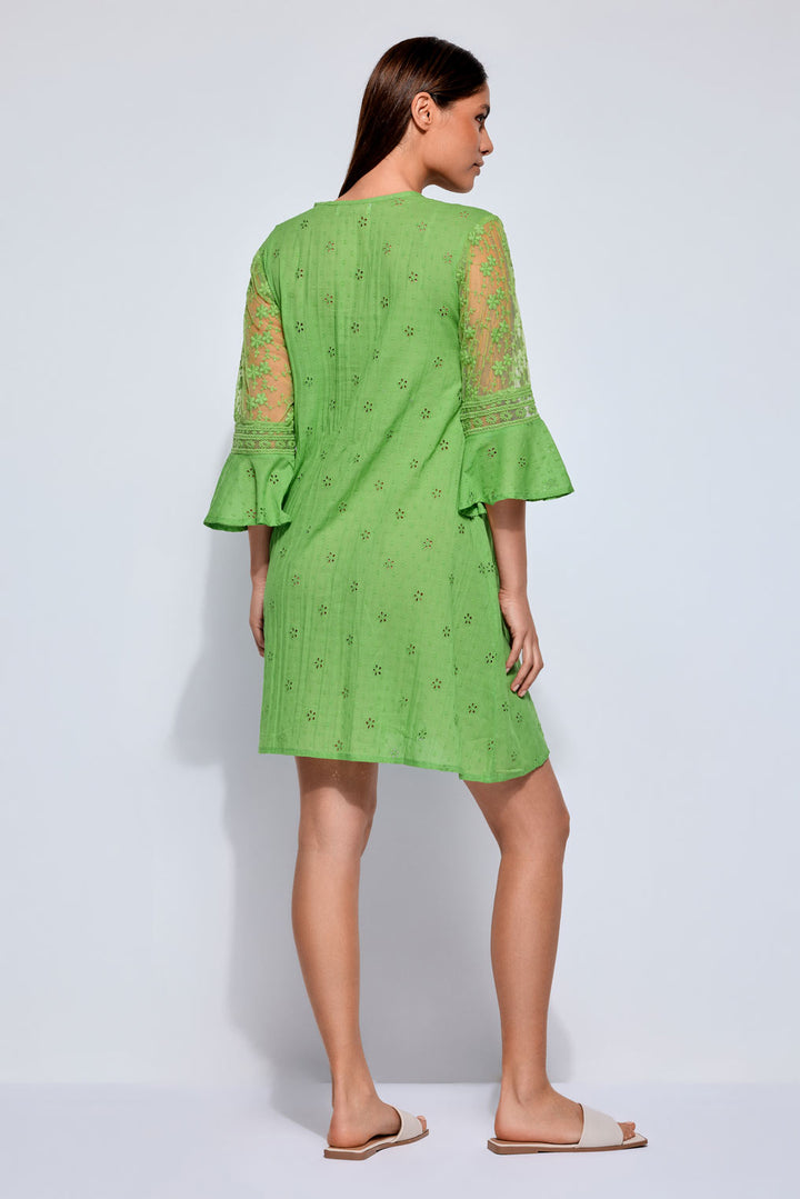 Este elegante vestido de encaje Sangallo de puro algodón se caracteriza por un diseño fluido y femenino. Las mangas ¾ y el escote en V añaden un toque de elegancia, mientras que el motivo bordado y la línea en A ofrecen un look sofisticado. Perfecto para cualquier ocasión.