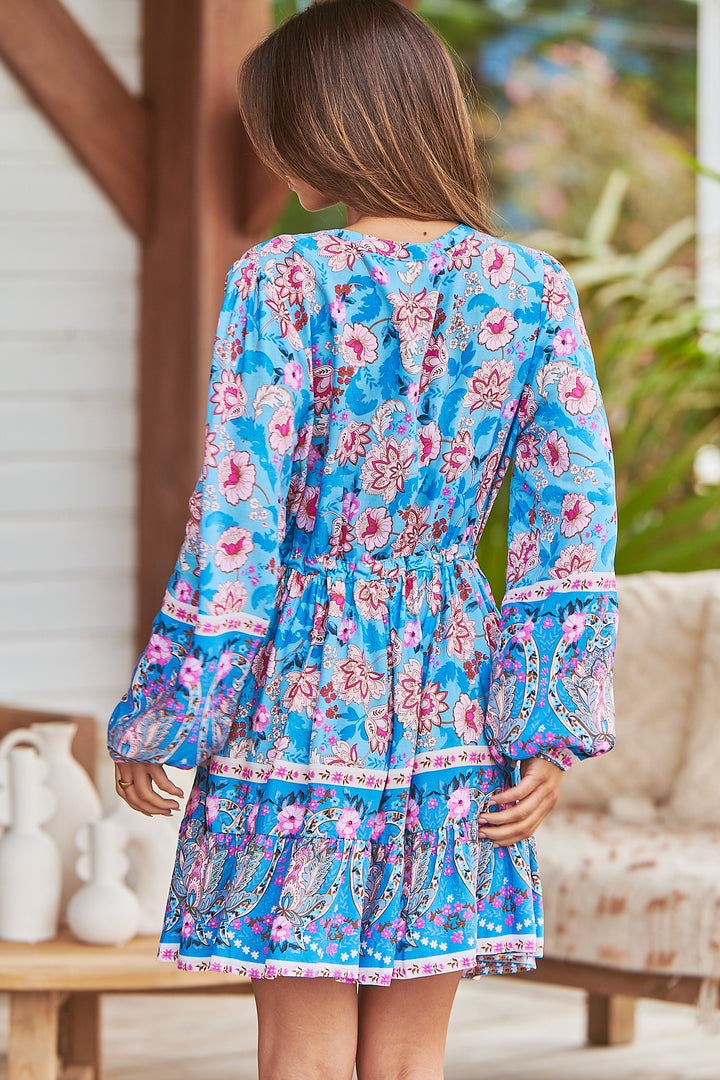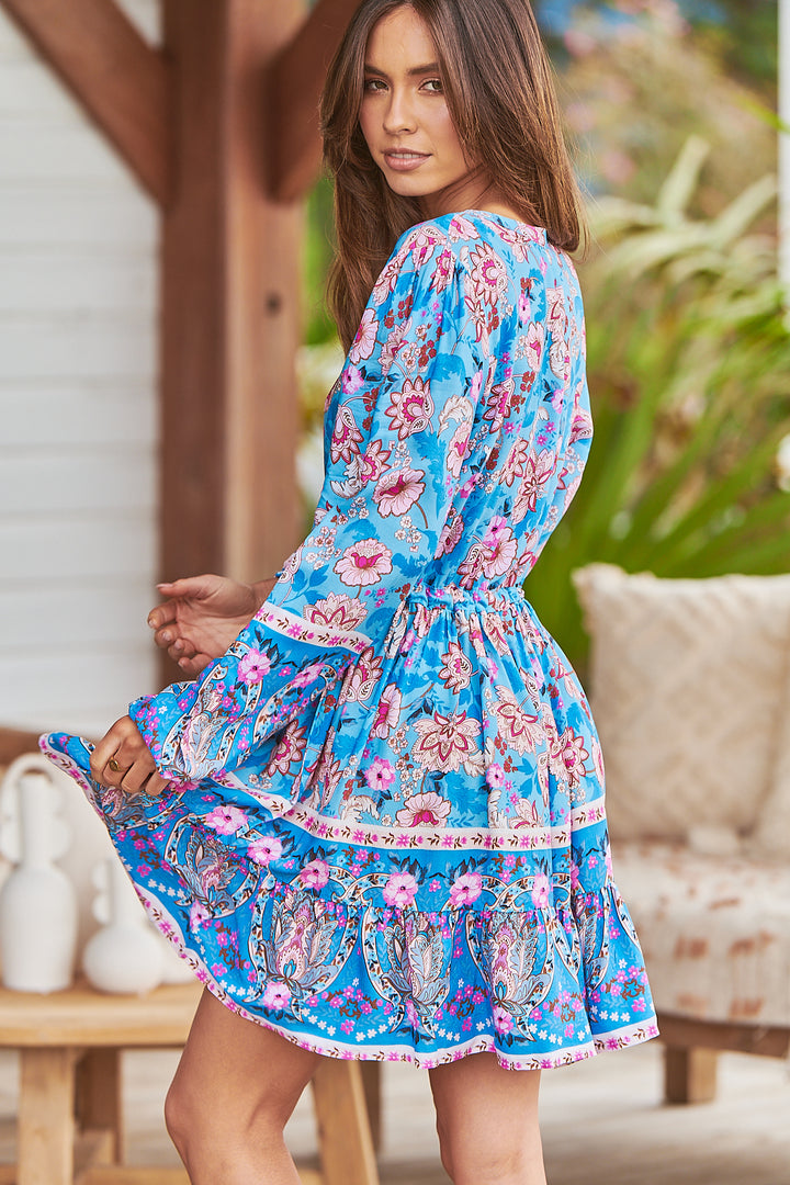 Déjate envolver por el fresco fantasia floral del vestido Santorini. Con escote abotonado y manga larga abullonada, este vestido es perfecto para el verano. La cintura vita y el dobladillo con volantes aportan un look elegante y cómodo.