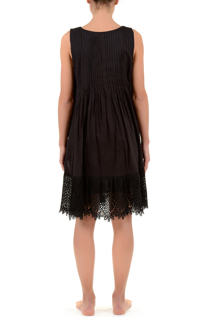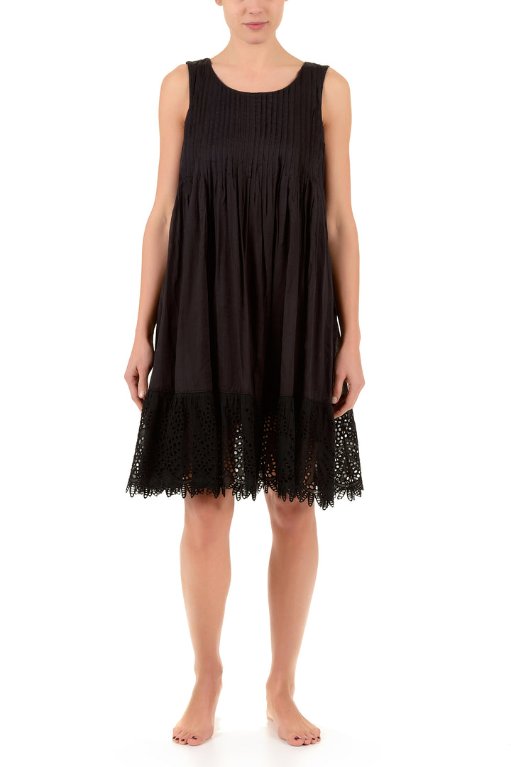 Este vestido negro sin mangas está hecho de algodón puro, garantizando una sensación de suavidad ideal para los días más calurosos. Los delicados insertos de encaje en el dobladillo añaden un toque de elegancia y sofisticación, equilibrando la simplicidad con detalles refinados. Perfecto para quienes buscan comodidad sin renunciar al estilo.