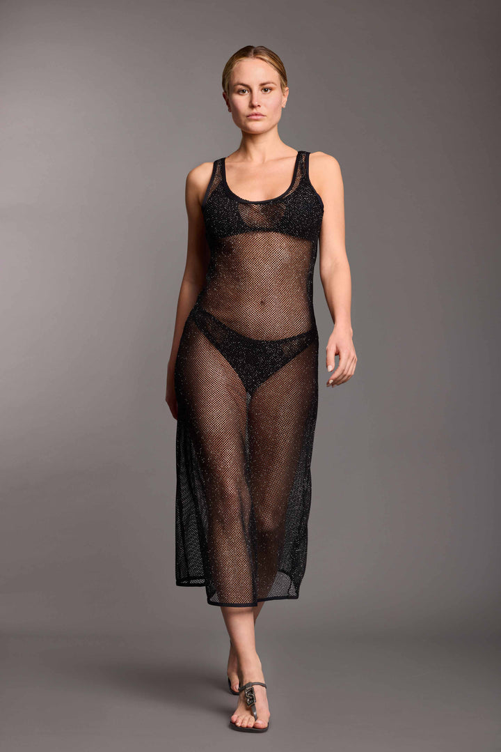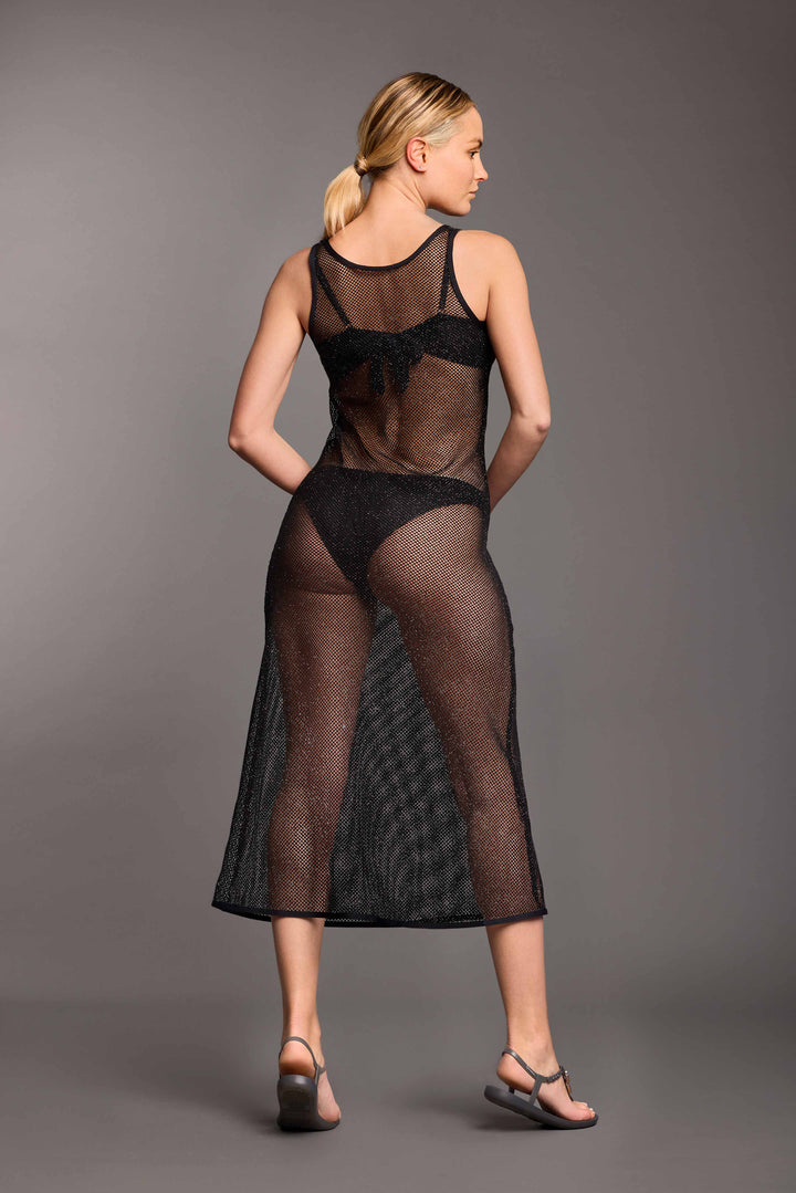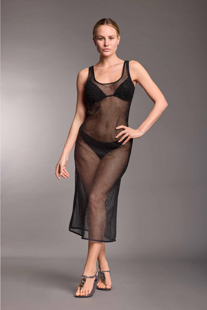 Con el vestido largo sin mangas Samira en tejido lurex negro, luce un look elegante y versátil para noches de verano o eventos casual chic. El diseño minimalista y ligero, con sin mangas y escote redondo, te hará sentir cómoda y a la moda. Tejido de red lurex para un toque de glamour.