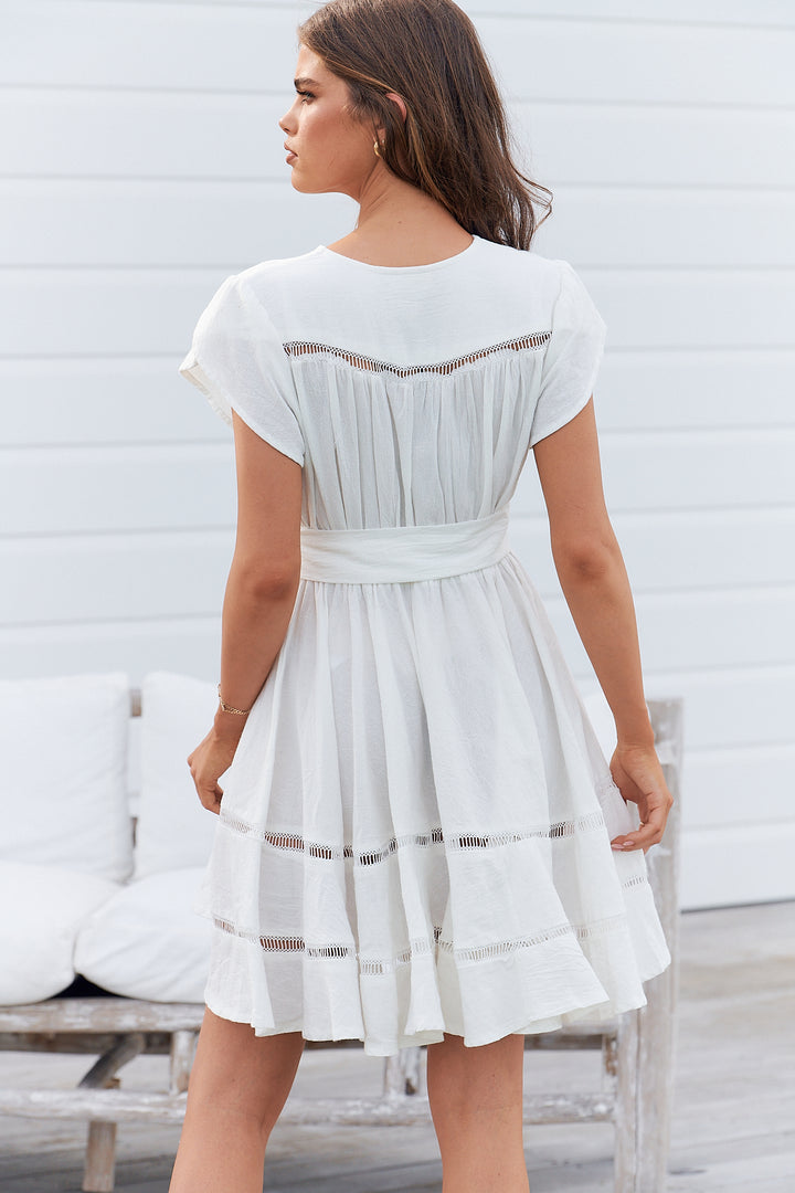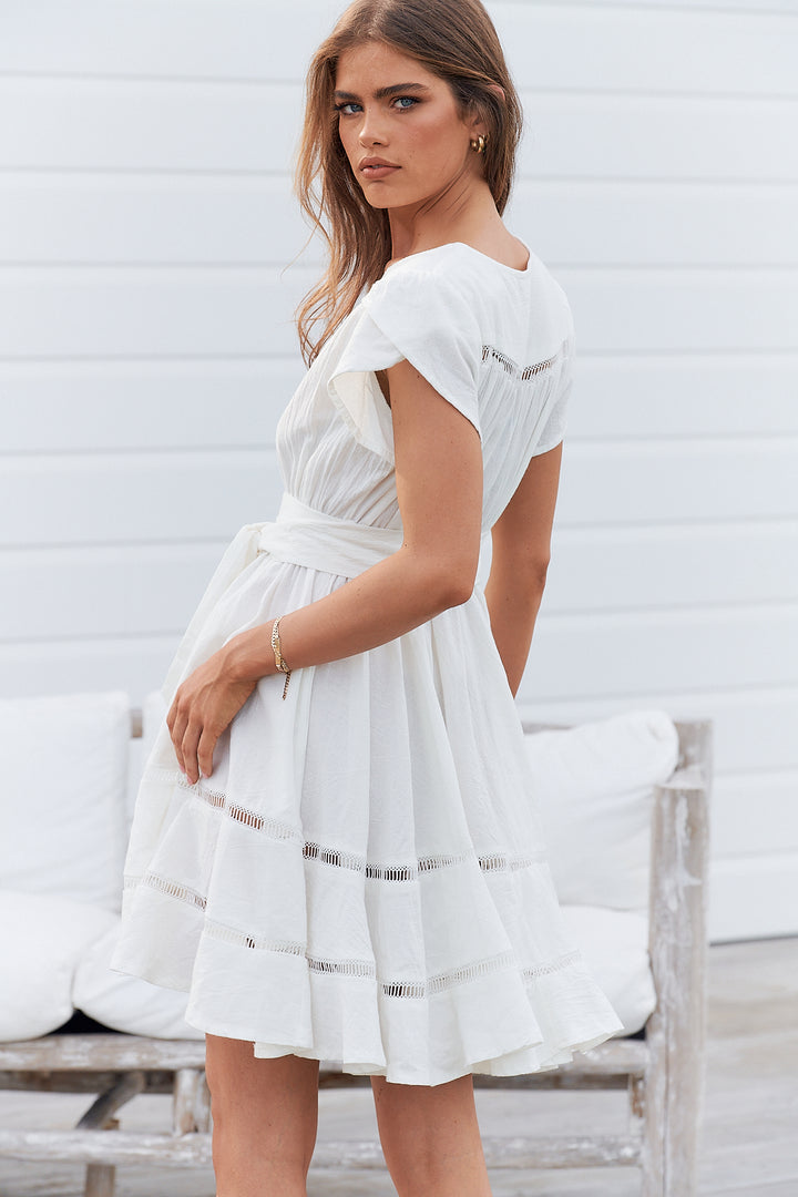 Este vestido de algodón blanco puro es perfecto para cualquier ocasión. Con escote en pico y cuerpo abotonado, es elegante y cómodo. La vita elástica con cinturón y las aplicaciones de encaje incrustadas aportan un toque de feminidad. Imprescindible para tu armario de primavera.