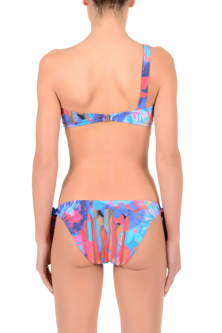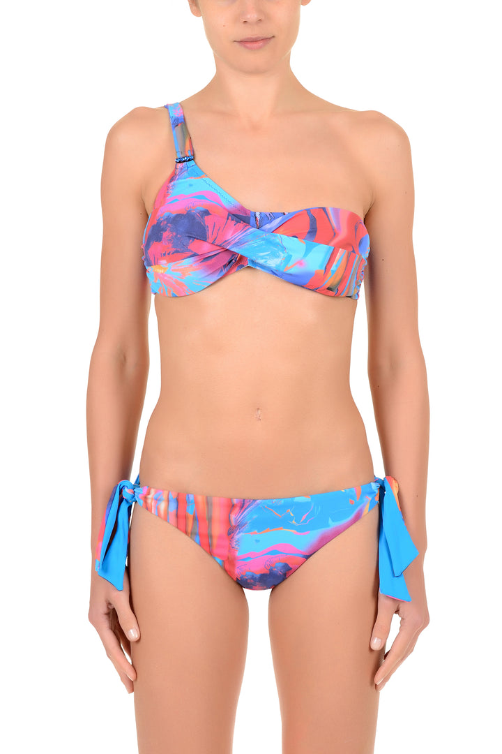 Bikini de estilo moderno y femenino, compuesto por un top de banda monohombro que realza la silueta con un toque elegante y asimétrico. La fantasía viva aporta un look veraniego y atractivo, perfecto para destacar bajo el sol. La braguita es ajustable gracias a los prácticos cordones laterales, pensados para garantizar comodidad y adaptabilidad a cada físico. Una mezcla perfecta de estilo y funcionalidad, ideal para distinguirse en la playa o junto a la piscina.