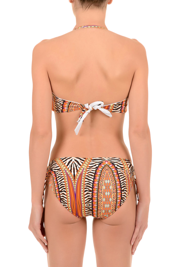 Descubre el bikini con atadura al cuello, caracterizado por una estampado animalier sofisticado que aporta un toque de audacia y estilo. El top se ata delicadamente al cuello para un ajuste personalizado y cómodo, mientras que la braguita coordinada está enriquecida con lazos laterales, añadiendo feminidad y detalles elegantes. Perfecto para quienes buscan un traje de baño que combine diseño refinado y comodidad en los días de playa.