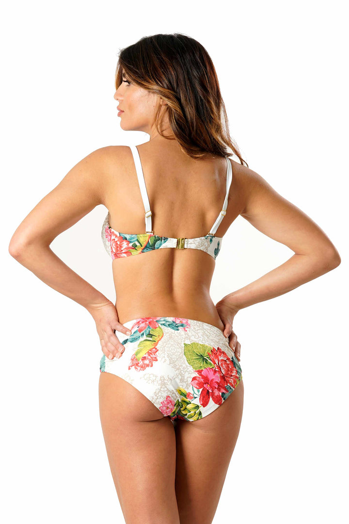 El bikini con aro es perfecto para quienes desean soporte sin la rigidez de las copas. El top presenta un ligero drapeado cruzado que crea un escote en forma de corazón. La braga cerrada en los lados garantiza una excelente cobertura.