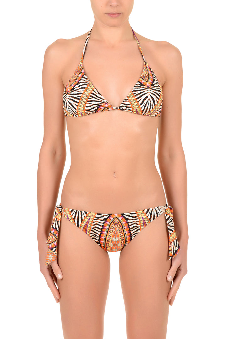 Este bikini de triángulo combina un diseño refinado con una estampado animal audaz, perfecto para quienes desean un equilibrio entre elegancia y vitalidad. El atado al cuello asegura un ajuste regulable, mientras que la braga con lazos añade un detalle femenino y personalizable. Ideal para quienes buscan comodidad y estilo en la playa o junto a la piscina.