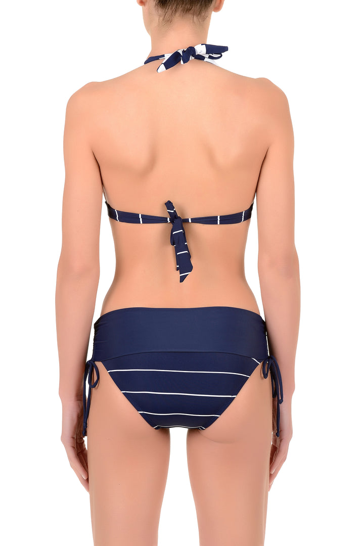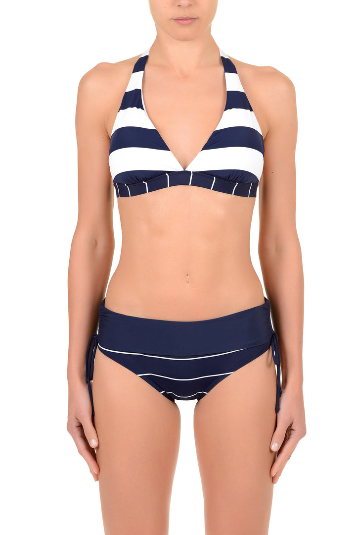 Este bikini triangulón a rayas con atadura al cuello une estilo clásico y comodidad óptima. El top con corte triangular garantiza un ajuste regulable y envolvente, mientras que la braguita clásica con banda ofrece soporte y un ajuste elegante. La fantasía a rayas añade un toque de sofisticación, perfecto para un look veraniego atemporal. Ideal para quienes buscan una prenda versátil y de calidad en el armario de playa.