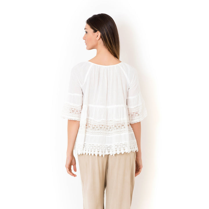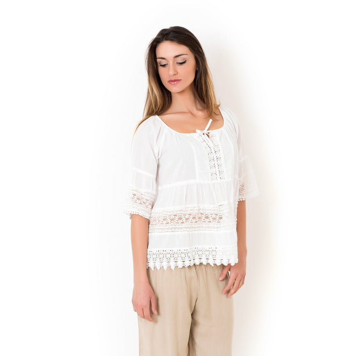 Esta elegante blusa blanca presenta delicados detalles de encaje que realzan su estilo refinado. Una prenda versátil adecuada tanto para ocasiones formales como para un look diario a la moda. El tejido transpirable garantiza comodidad manteniendo un aspecto cuidado.