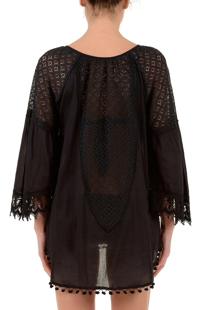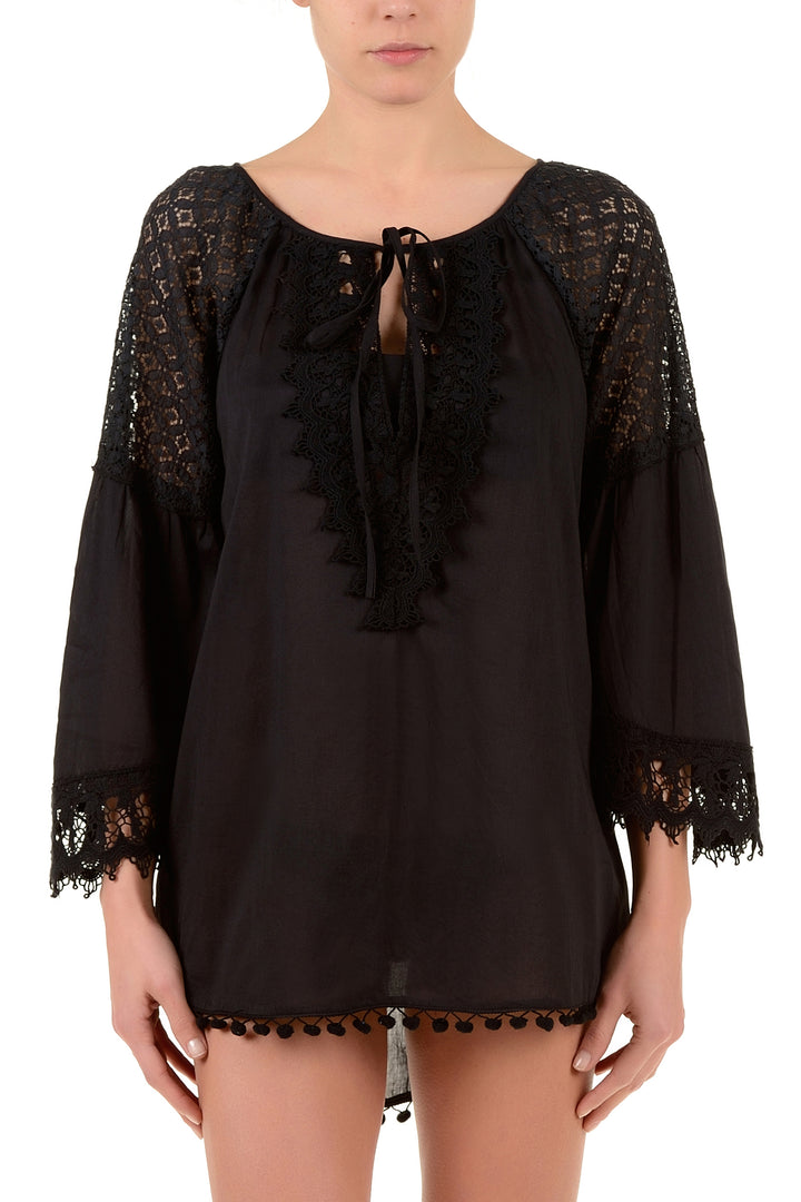 Esta blusa elegante en negro presenta inserciones de encaje refinadas en las mangas 3/4 y en el escote, aportando un toque de sofisticación. Las borlas en el dobladillo añaden un detalle original y distintivo, ideal para enriquecer cualquier conjunto con clase y estilo.