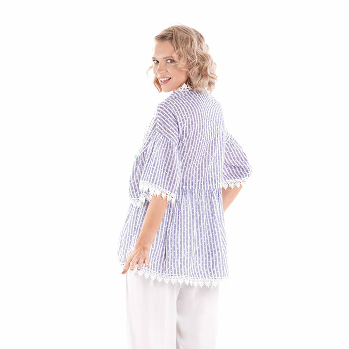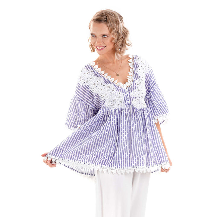 Esta blusa de algodón puro con un fascinante juego de rayas y lunares captura el espíritu de la moda costera italiana. El escote en V realza la elegancia de la silueta, mientras que el delicado encaje Sangallo aplicado aporta un toque de refinada artesanía. Una prenda versátil que combina comodidad y estilo, perfecta para quienes aprecian los detalles de calidad y la simplicidad sofisticada.