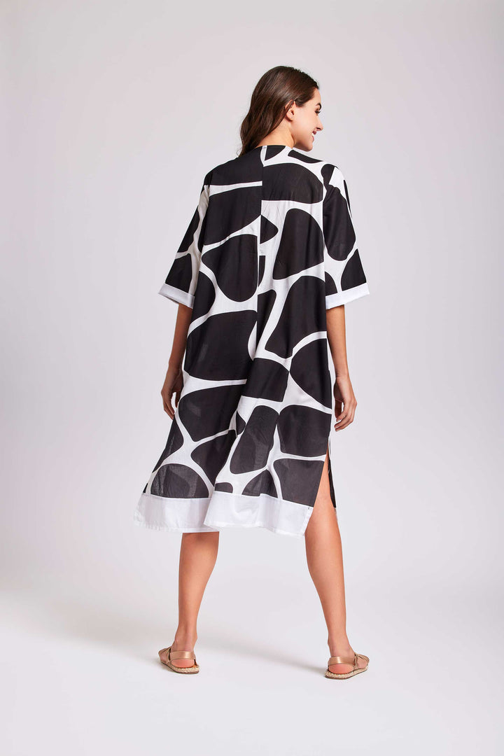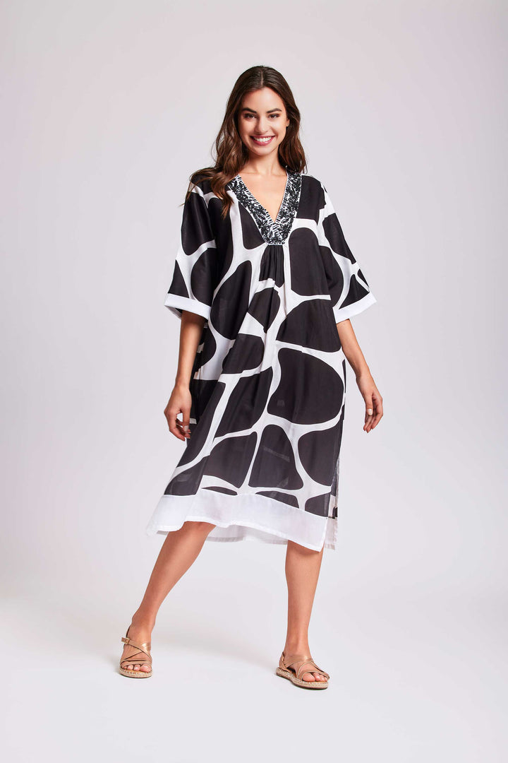 Este elegante caftán largo presenta un diseño fantasia en negro, perfecto para un look elegante y moderno. Las mangas 3/4 lo hacen versátil para cualquier ocasión, mientras que el escote en pico con aplicaciones le aporta un toque de refinamiento. Con aberturas laterales, este caftán ofrece un ajuste cómodo y moderno.