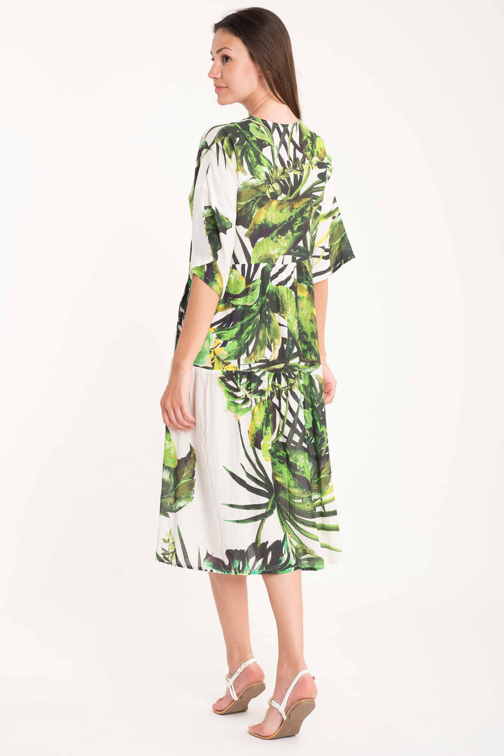 El caftán largo tropical está caracterizado por una vívida fantasía tropical que captura la esencia del verano. El diseño amplio y cómodo garantiza libertad de movimiento, perfecto para días en la playa o noches en la ciudad. Una prenda versátil que se adapta a múltiples ocasiones, desde la playa hasta los aperitivos de verano, manteniendo siempre un aire sofisticado y contemporáneo.