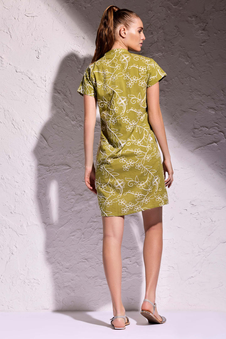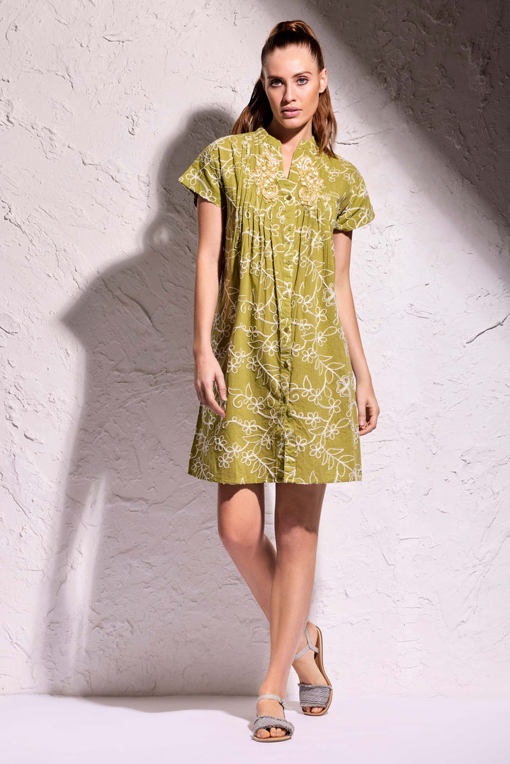 Descubre la comodidad y la practicidad del caftán de puro algodón con corte en A y manga corta. Su largo medio lo hace perfecto para cualquier ocasión, mientras que la botonadura delantera facilita su uso. El bordado realizado a mano con hilo de lúrex aporta un toque único y elegante.