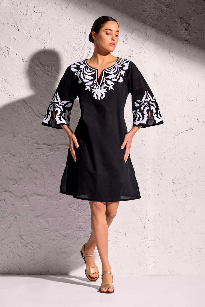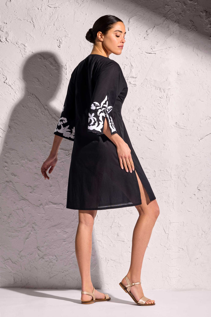El caftán Zelda es una prenda de verano versátil y con estilo, perfecta para las vacaciones. Hecho de algodón puro, cuenta con una elegante impresión en contraste, un diseño amplio y cómodo, un escote en V y mangas 3/4, ofreciendo tanto comodidad como elegancia.