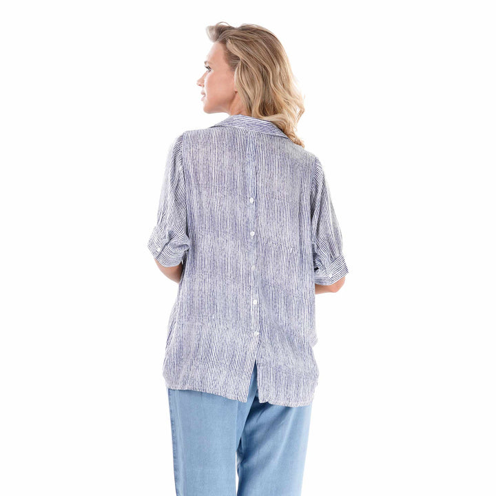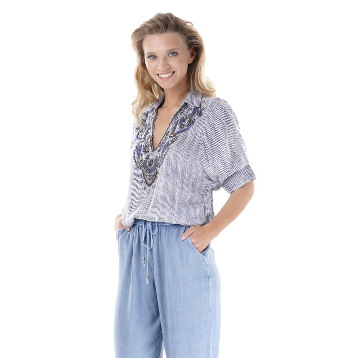 Esta camisa a rayas combina un diseño elegante con detalles refinados. Los bordados finamente realizados y las cuentas añaden un toque de sofisticación, haciendo que la prenda sea ideal para quienes buscan un look distintivo y cuidado en los mínimos detalles. Perfecta para ocasiones formales o para enriquecer conjuntos casuales con estilo.