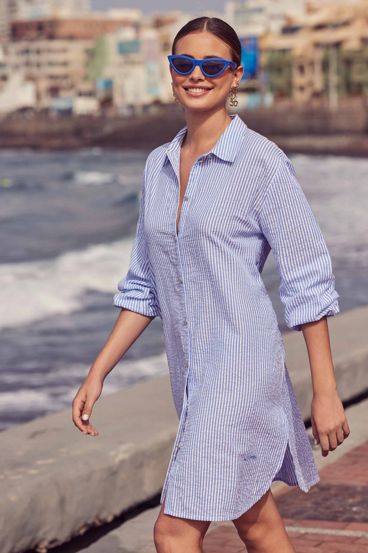 La camisa Giorgia de puro algodón es versátil y fresca, perfecta como top o cubre traje de baño durante el verano. La amplitud de su corte, la fantasía a rayas y el diseño fresco la hacen ideal para outfits casuales. Con cuello y botones al frente, está hecha de puro algodón.