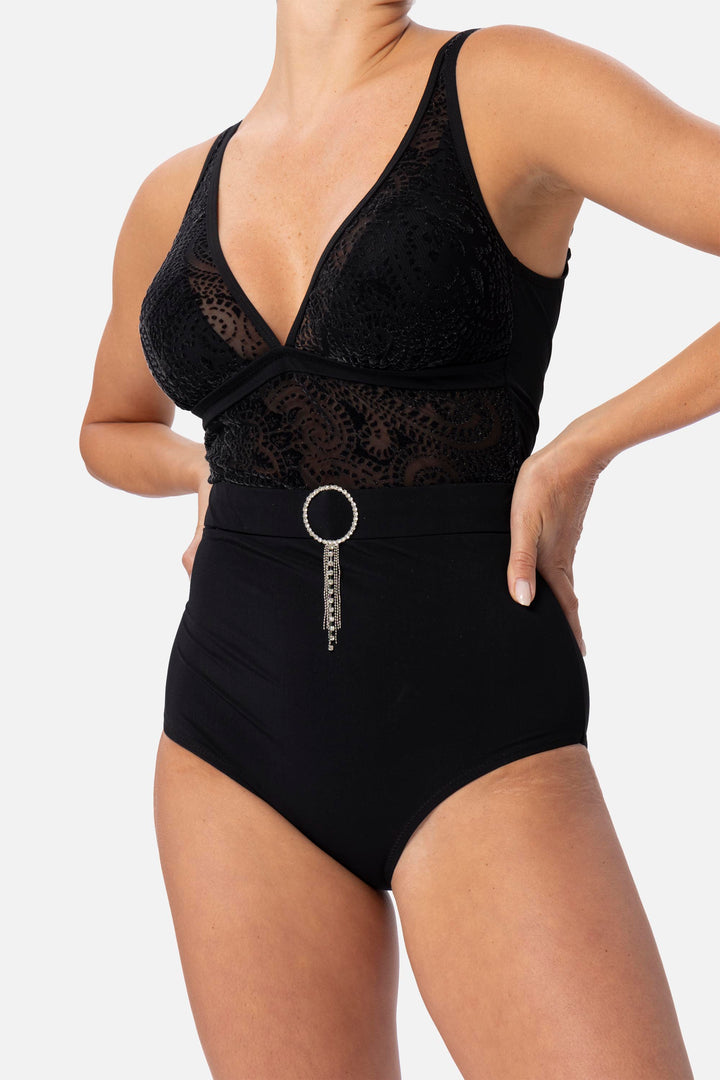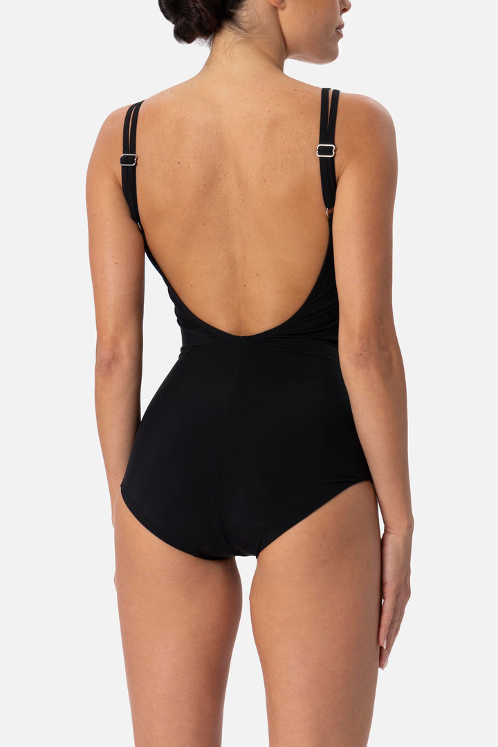 El traje de baño entero Grace negro es sinónimo de elegancia y soporte, perfecto para un look sofisticado. La tela elástica y moldeadora garantiza un ajuste perfecto, mientras que las copas removibles y las tirantes ajustables ofrecen comodidad y soporte. El detalle de joya y el escote en V añaden un toque de lujo a tu atuendo de baño.