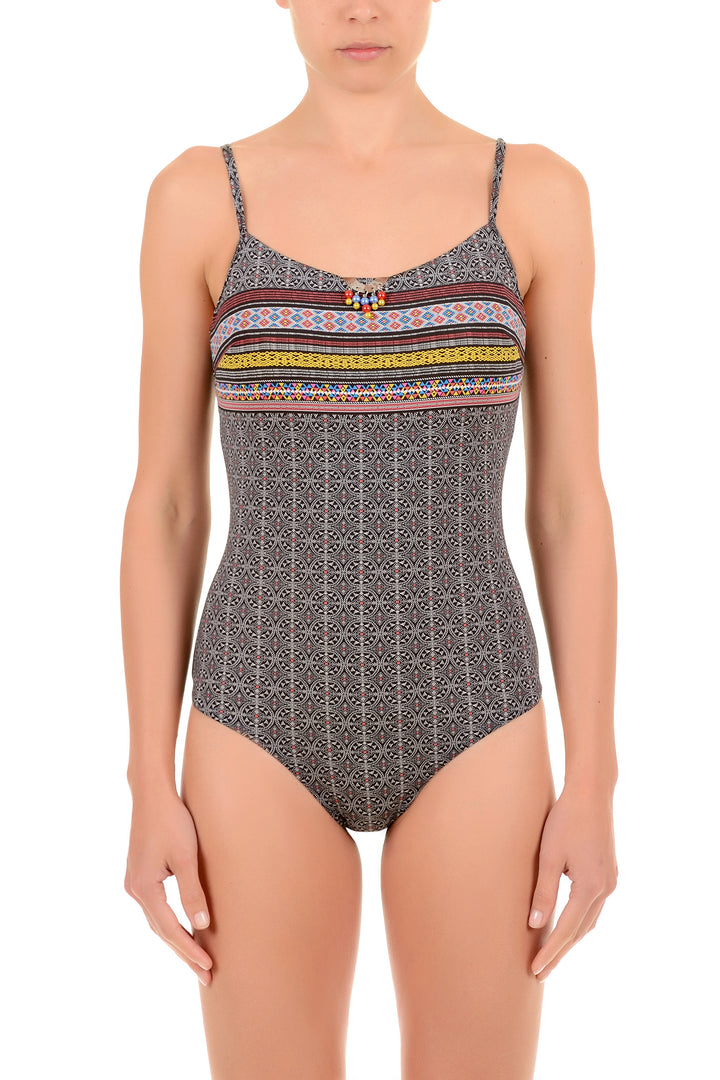El bañador entero Kristel con tirantes ajustables garantiza un ajuste personalizado y cómodo para cada tipo de cuerpo. La fantasía étnica caracteriza el diseño, conferiendo una estética sofisticada y cuidada a la prenda. Ideal para quienes buscan un equilibrio entre estilo contemporáneo y detalles inspirados en las tradiciones textiles internacionales. Una pieza versátil que se distingue por la calidad constructiva y la atención a los detalles, perfecta para quienes aprecian la elegancia consciente en la ropa de playa.