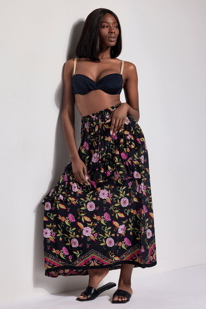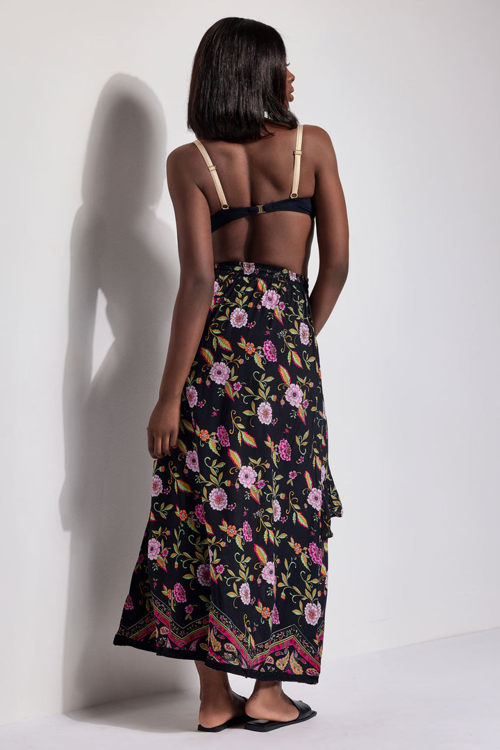 Falda larga con fantasía floral, caracterizada por un elástico en cintura para un ajuste cómodo. El volante central añade movimiento, mientras que el detalle de encaje en el fondo aporta un toque de elegancia. Perfecta para un look boho-chic y romántico, ideal para la temporada de verano.