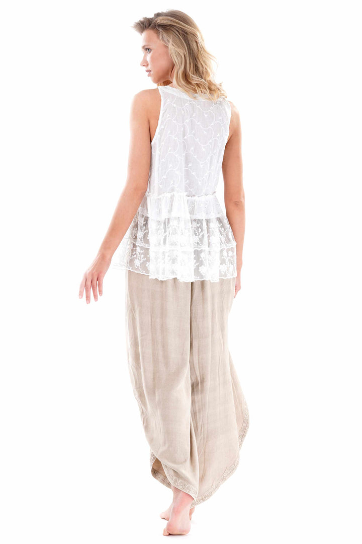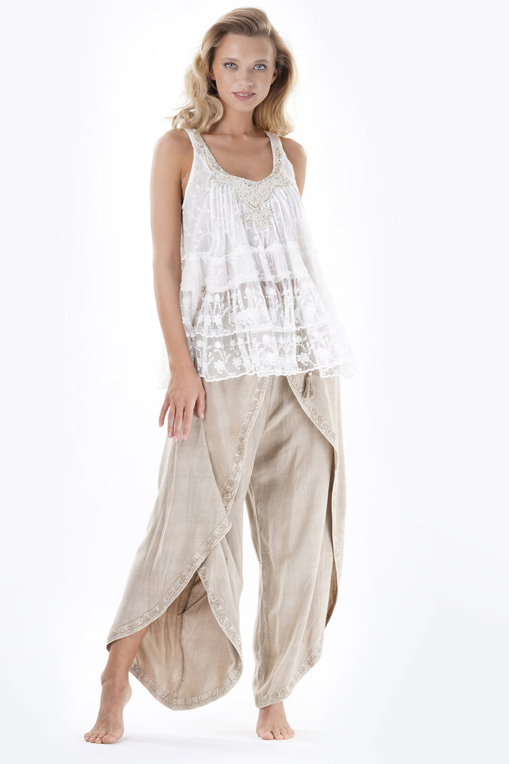 Estos pantalones se distinguen por un refinado corte en V que realza la silueta con elegancia. Enriquecidos con bordados delicados, ofrecen un toque distintivo sin renunciar a la comodidad. Perfectos para quienes buscan una prenda versátil y cuidada en los detalles.