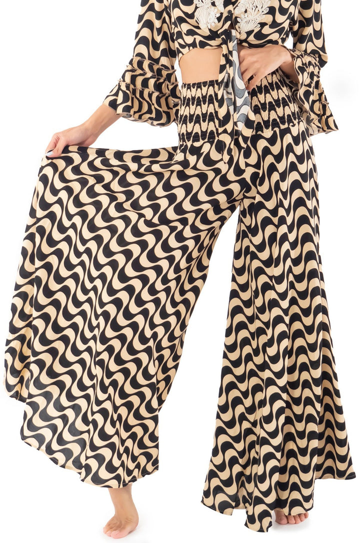 Pantalones palazzo de silueta fluida y contemporánea, caracterizados por una fantasía geométrica ondulada que captura movimiento y profundidad. El cordón en la cintura garantiza un ajuste cómodo y regulable, perfecto para quienes buscan elegancia sin compromisos. Una prenda versátil que se presta a múltiples ocasiones, desde el día hasta la noche, encarnando el espíritu sofisticado de la moda mediterránea.