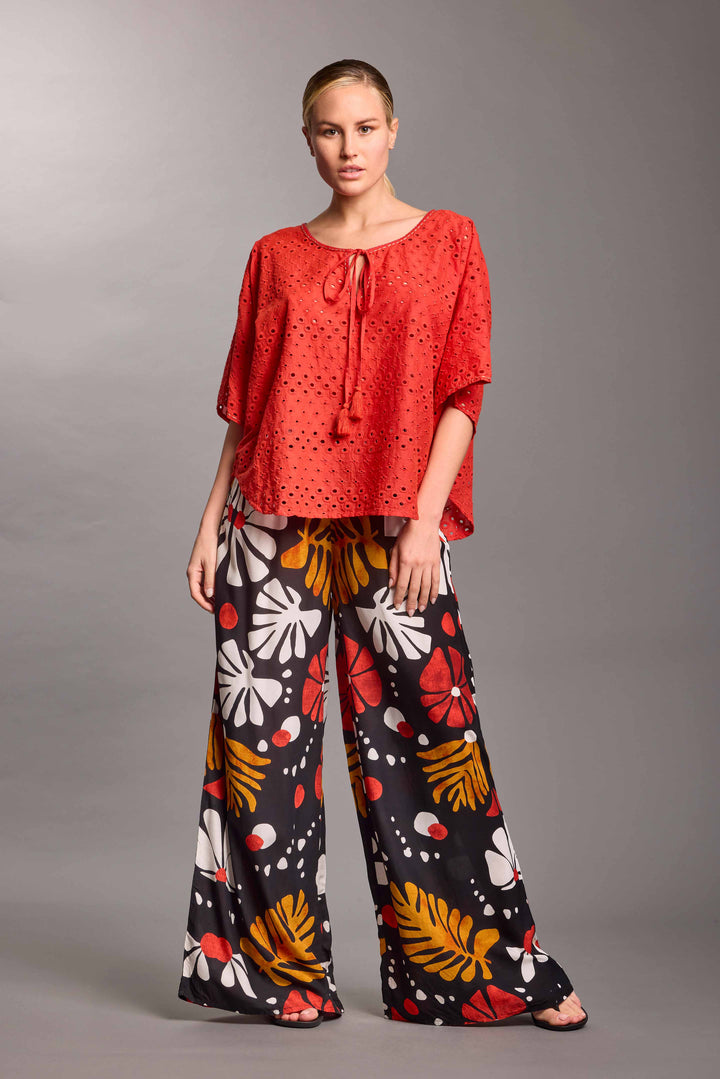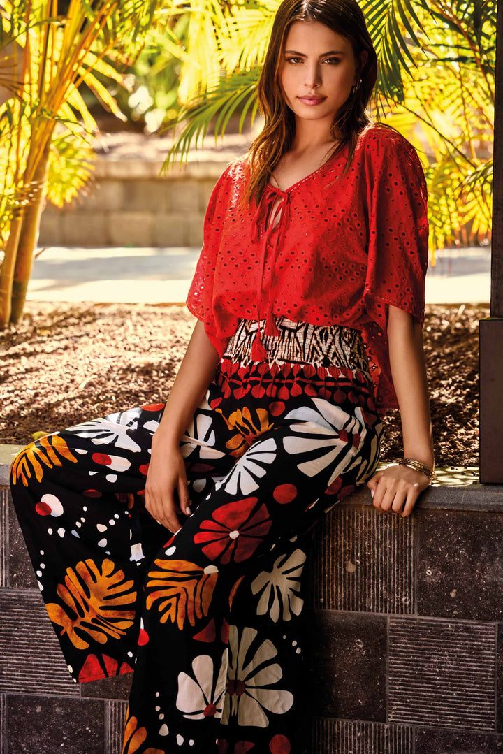 Los pantalones Palazzo Iole combinan estilo y comodidad gracias a su pierna ancha y al estampado multicolor chic. Ligeros y adecuados para diversas ocasiones, ofrecen un look veraniego fresco y sofisticado. Con la goma en la cintura, son perfectos para conjuntos casuales o formales.