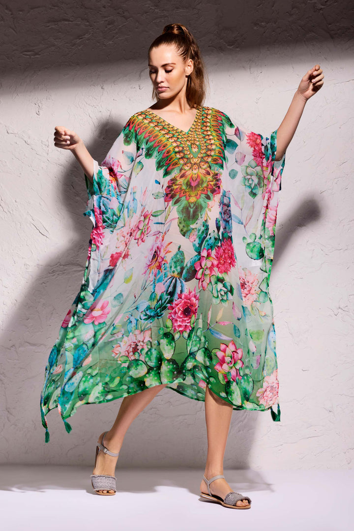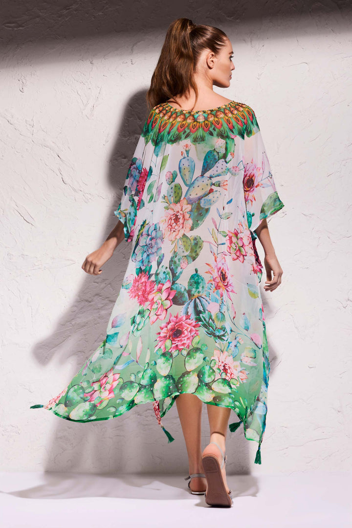 Este elegante poncho floral con cristales cosidos a mano es perfecto para añadir un toque de feminidad a tus conjuntos. El modelo largo y el escote en pico lo hacen versátil y cómodo, mientras que las mangas murciélago y las aberturas laterales lo hacen moderno y chic. Completa tu look con borlas al final para darle un toque de originalidad.