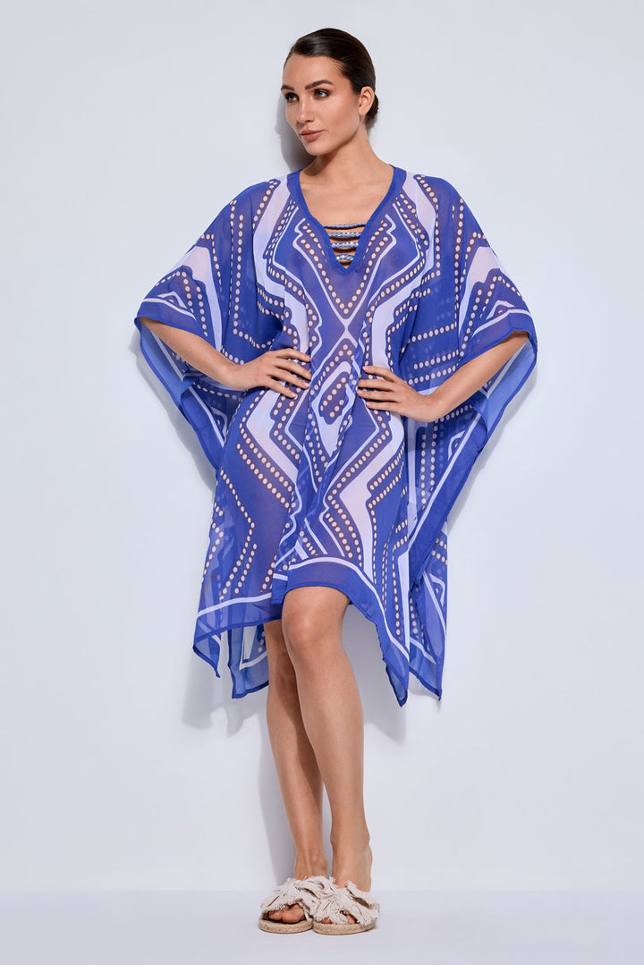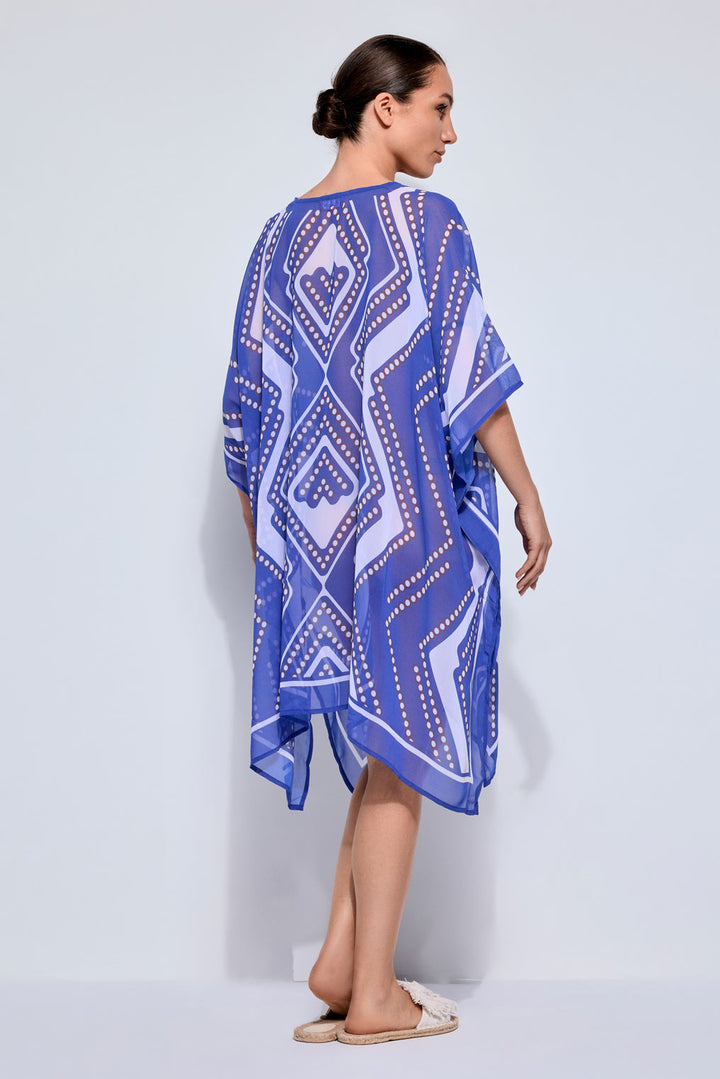Poncho Geométrico, perfecto como cubrecostume, este poncho de tejido georgette ofrece un ajuste cómodo y ligero. La fantasía geométrica añade un toque de originalidad a tu look, haciéndolo ideal para tus días de verano en la playa.