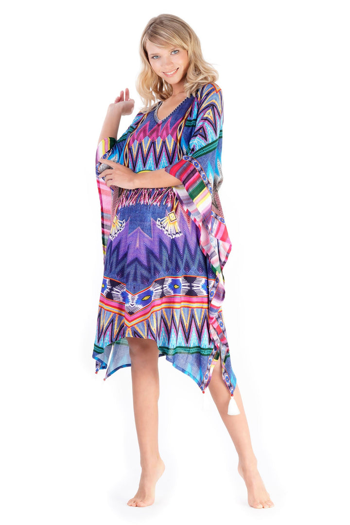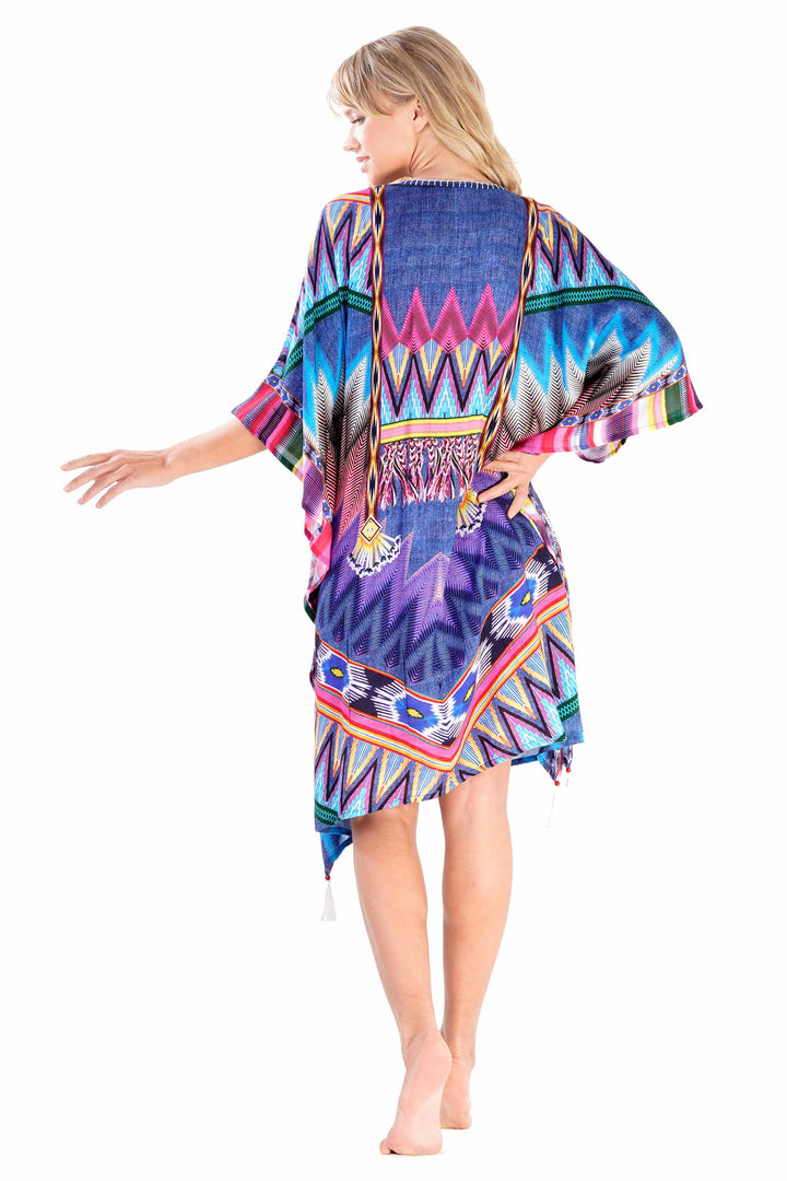 Este poncho presenta un refinado escote en V y una fantasía inspirada en motivos étnicos que añade un toque de elegancia cultural. Su diseño único incluye borlas en el dobladillo, que aportan movimiento y textura con discreción.