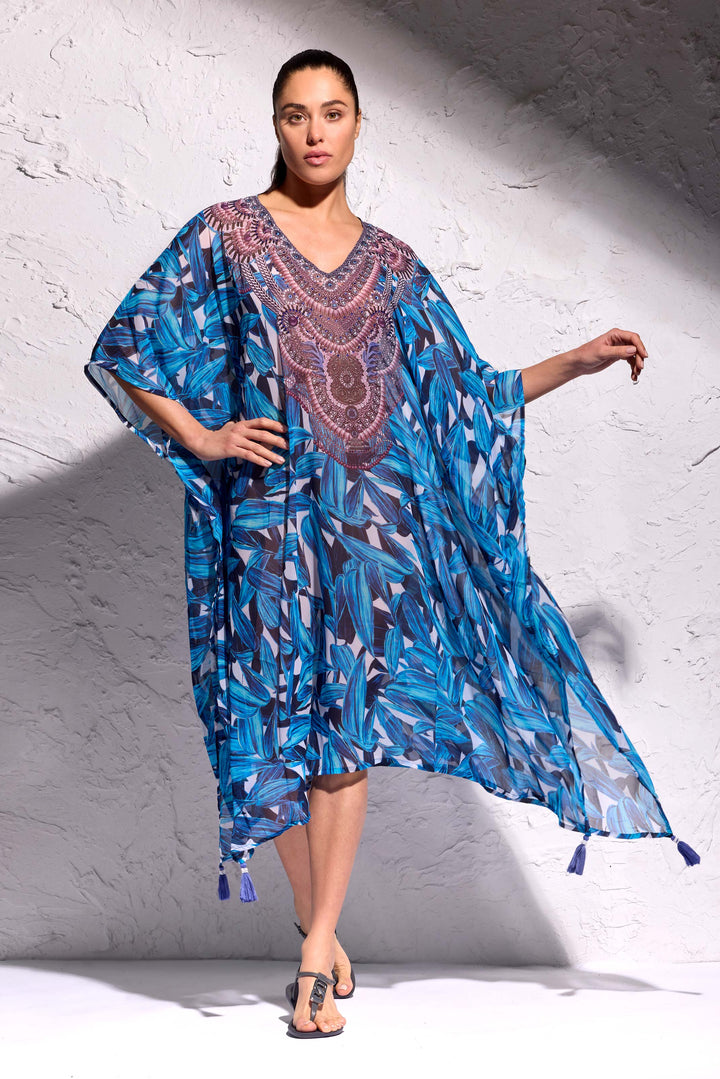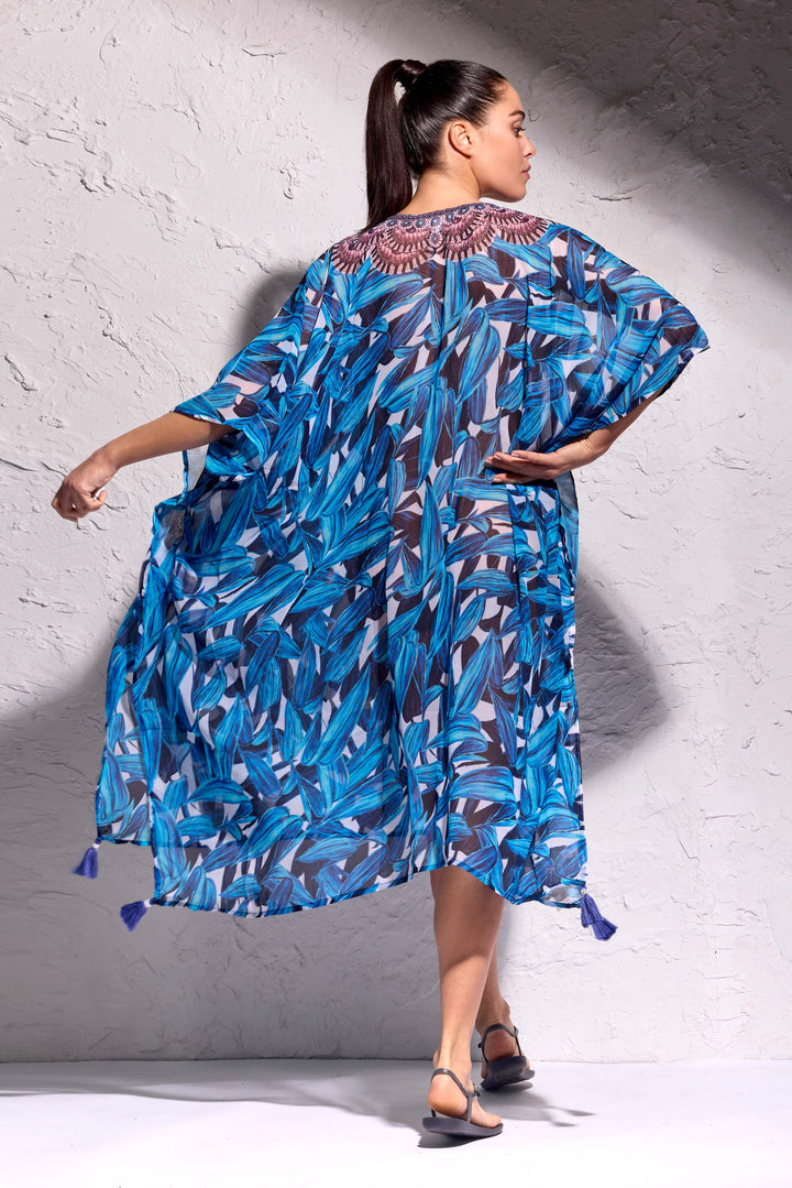 Con el Poncho Leaves mantente al día de las últimas tendencias. El modelo largo y fantasia de hojas añade un toque de estilo a tu día. Con escote en pico y aplicaciones, este poncho es perfecto para cualquier ocasión. Las mangas de murciélago y las aberturas laterales garantizan comodidad, mientras que las borlas al final completan el look.